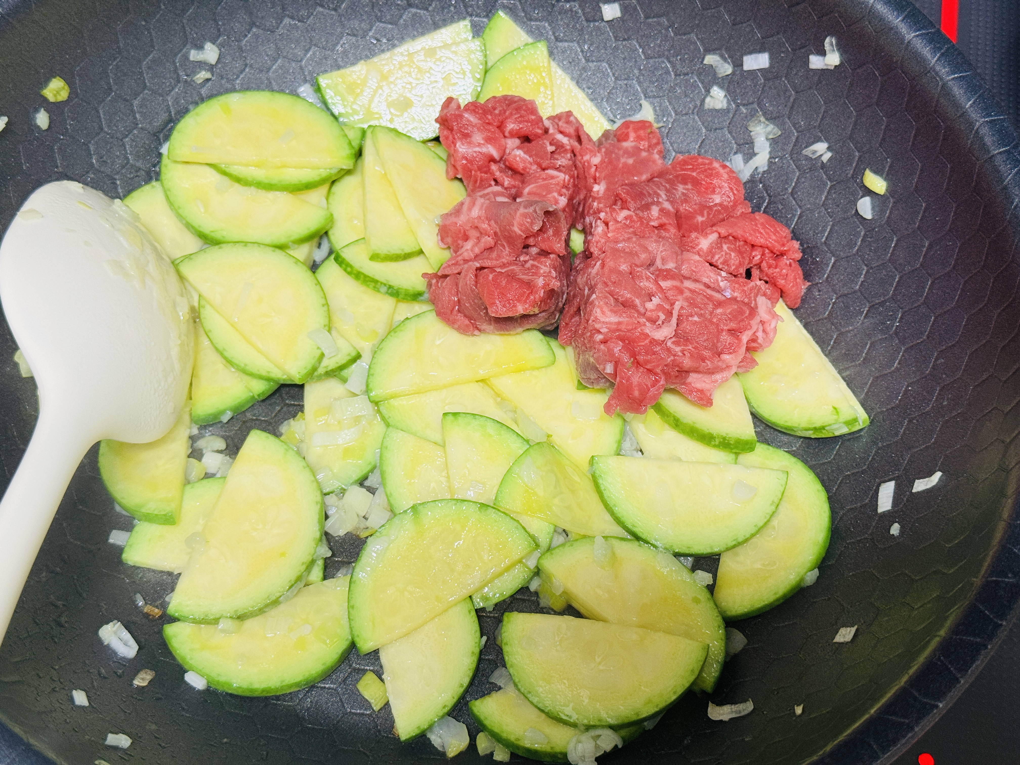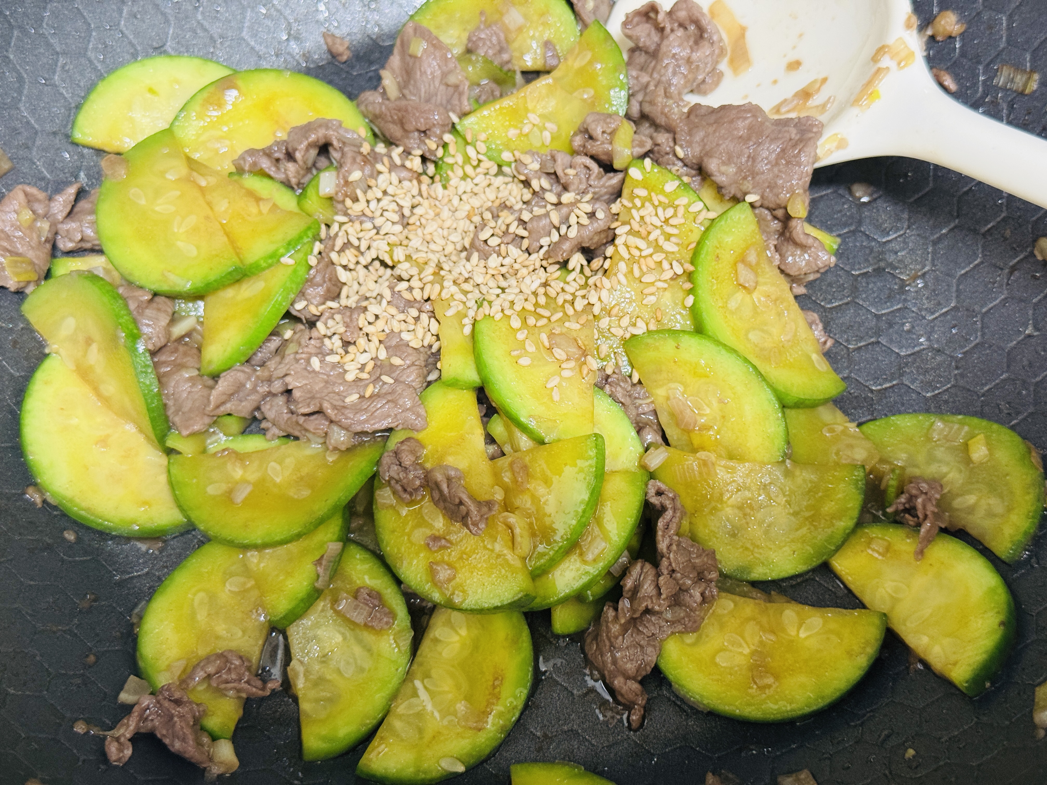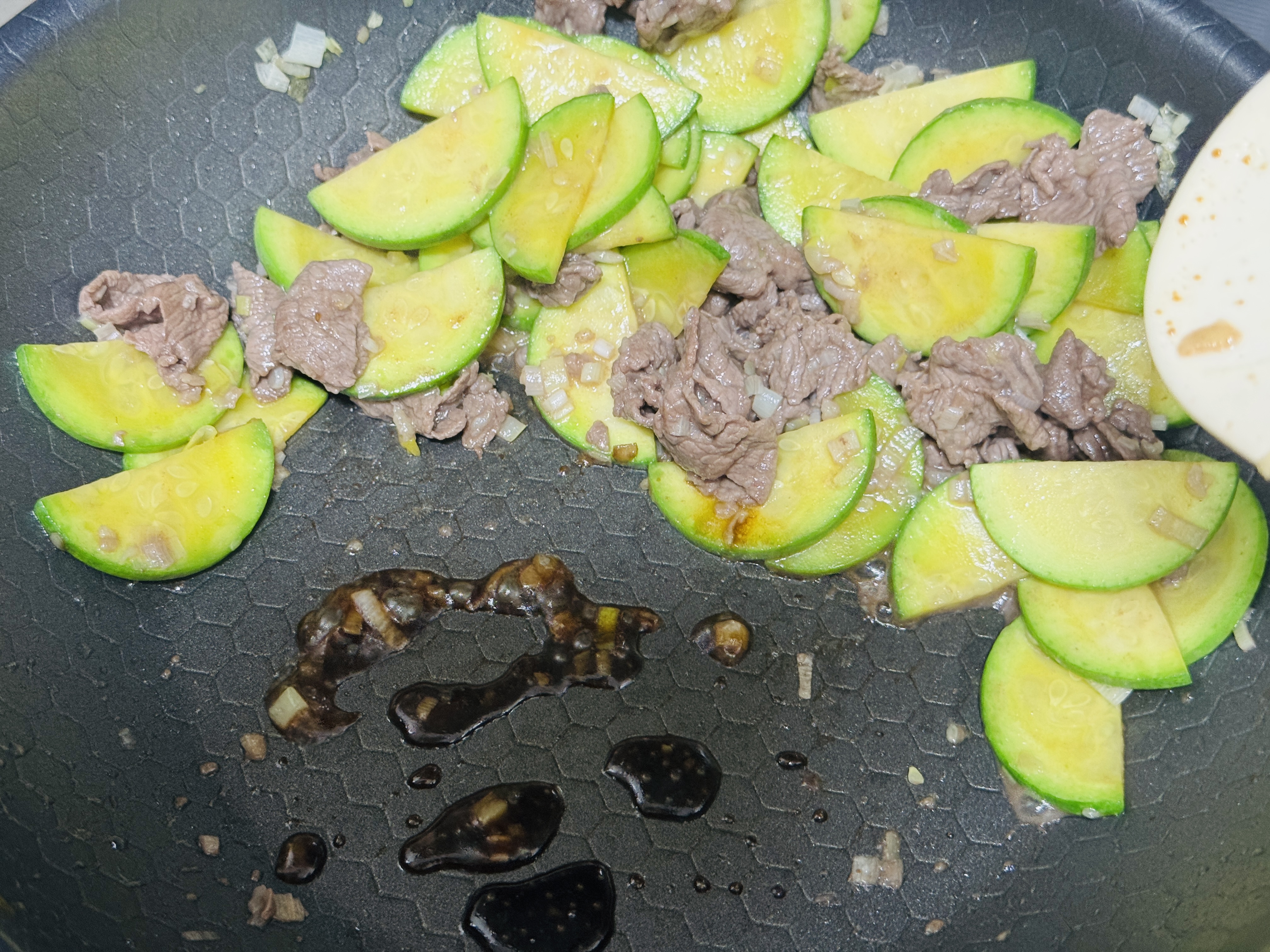 애호박이 살짝 익으면 소고기를 넣어 함께 볶아줍니다.