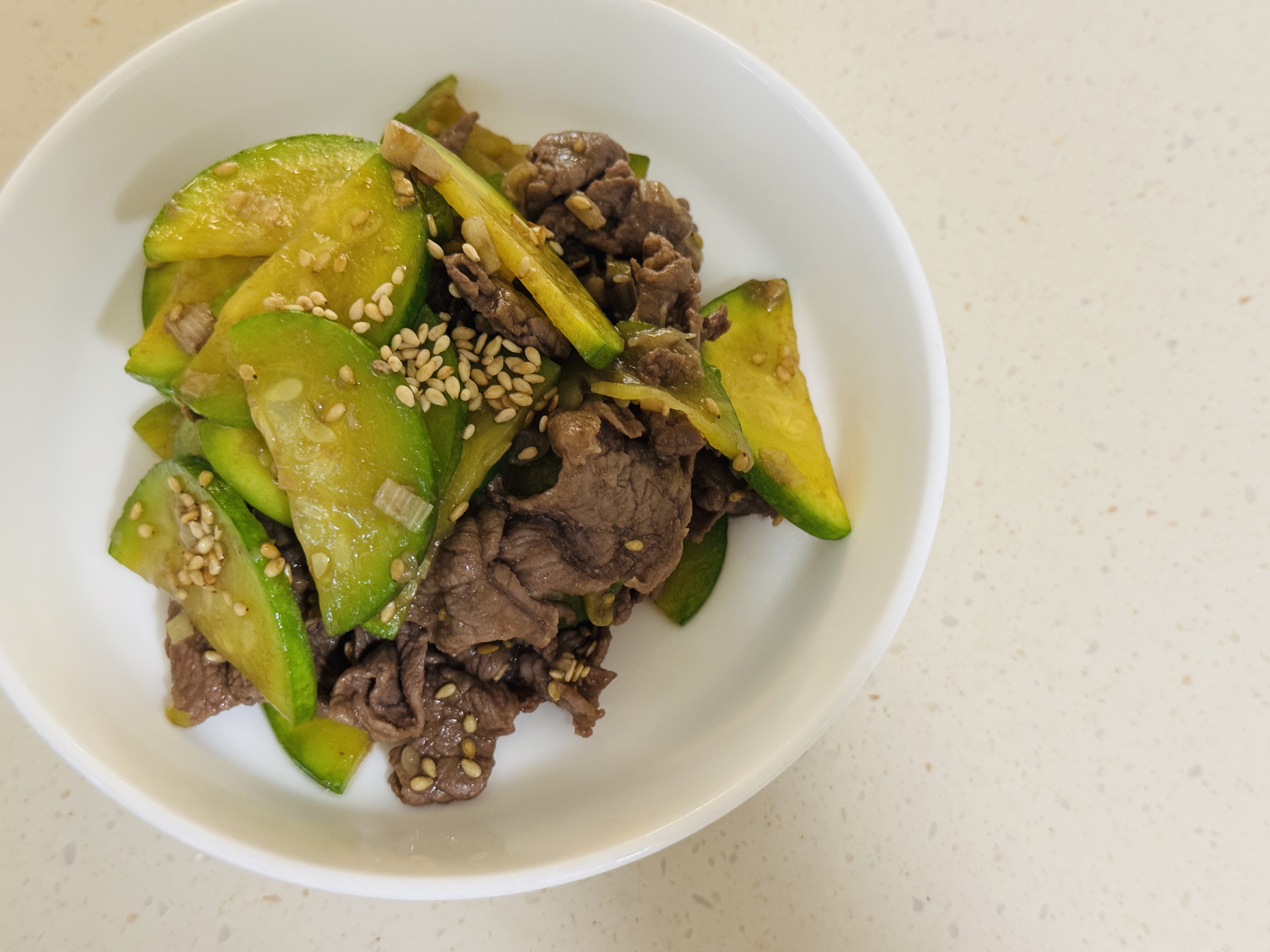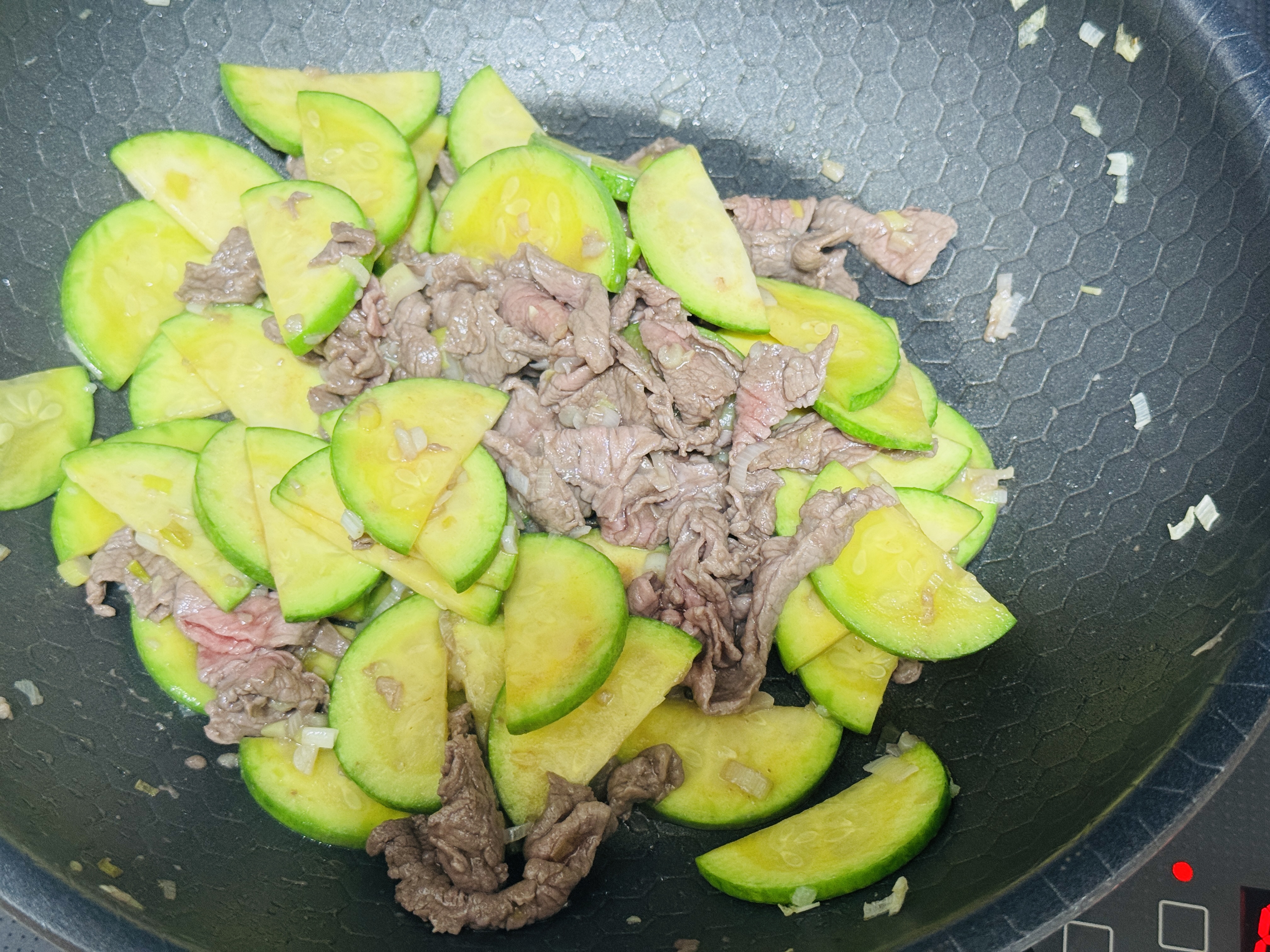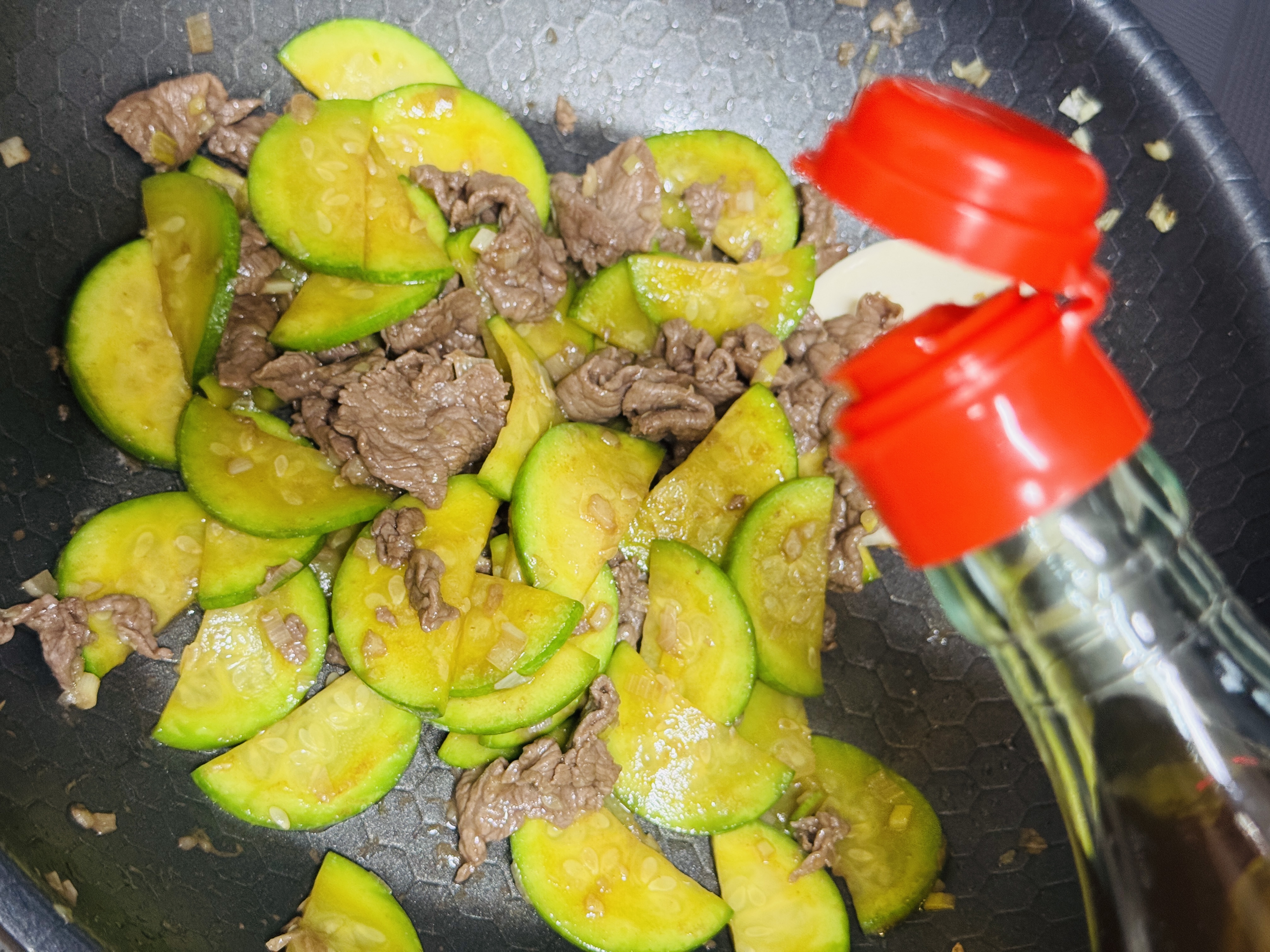 애호박이 살짝 익으면 소고기를 넣어 함께 볶아줍니다.