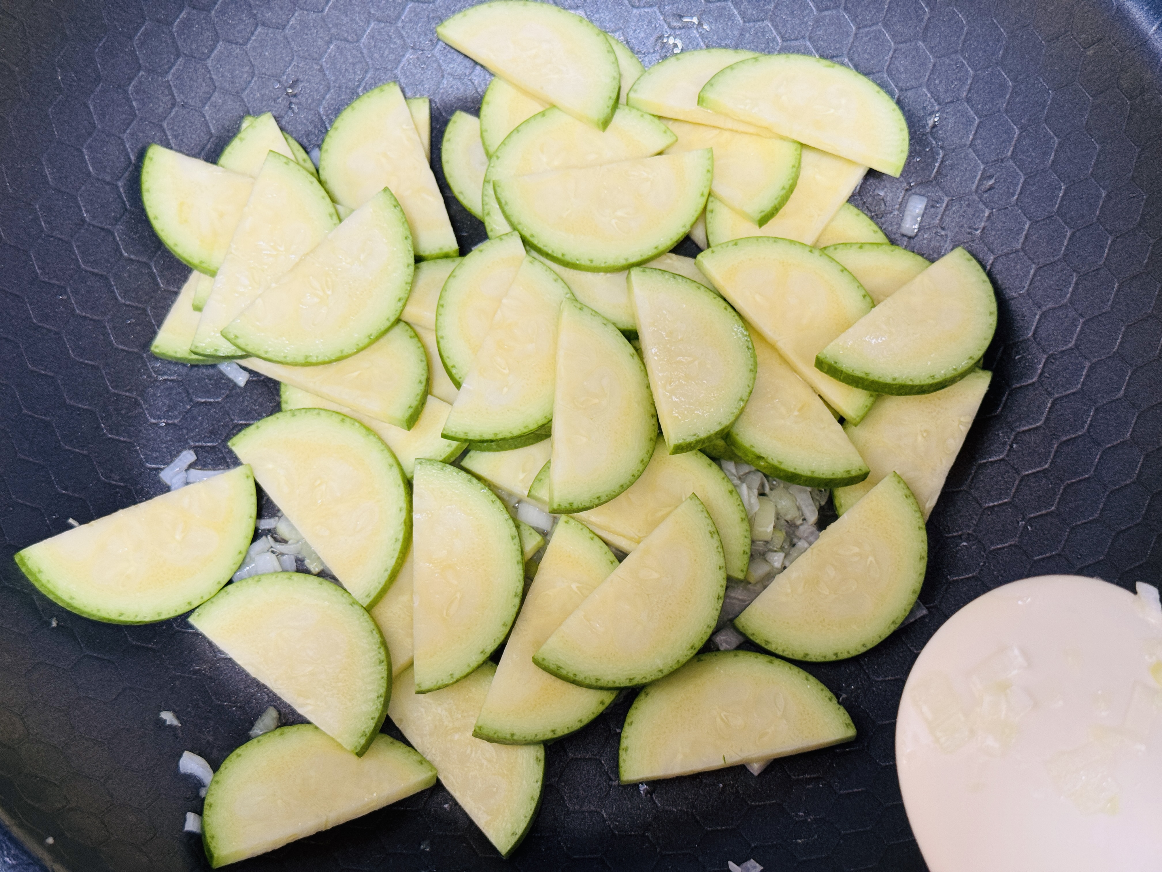 향이 올라오면 애호박을 넣어 볶아줍니다.