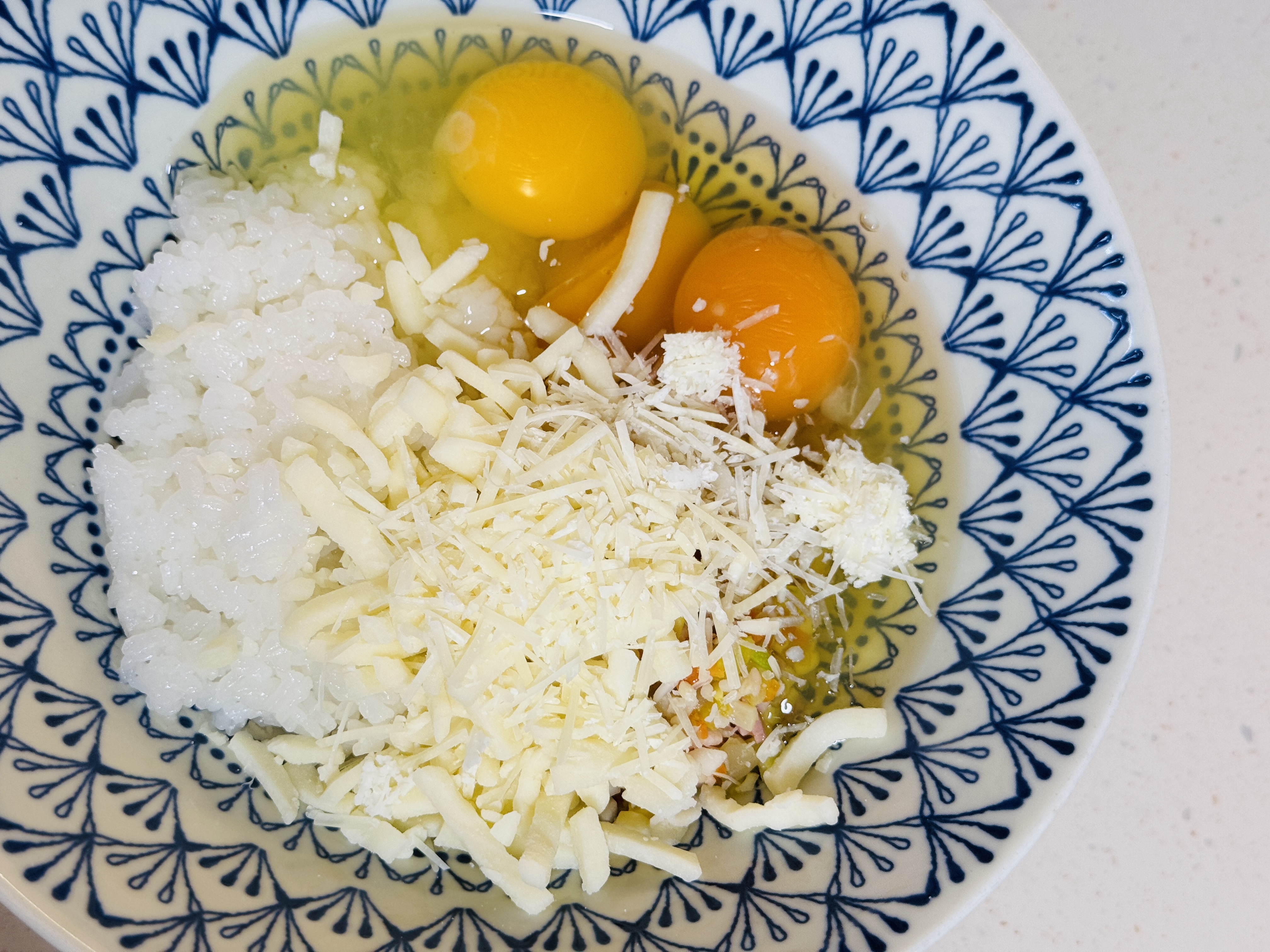 밥에 야채 볶은것을 넣고(저는 야채 많이 들어가는 것을 좋아해서 많이 넣었어요:) 달걀 3개, 모짜렐라 치즈, 파마산 치즈도 취향껏 넣어주세요. 후추, 소금을 넣어 간을 맞춰주세요.