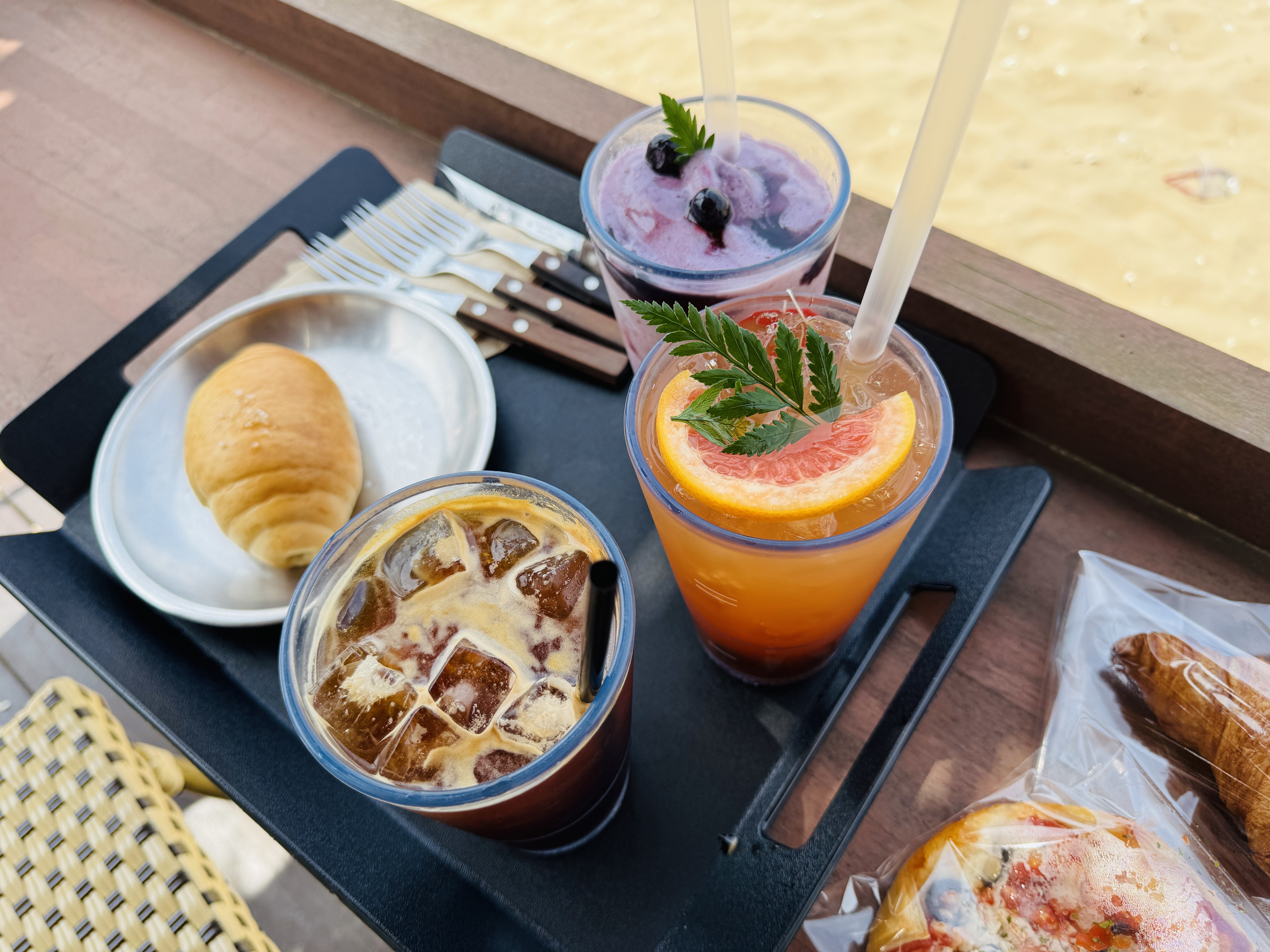 블루베리 스무디, 허니 자몽 블랙티, 아이스 아메리카노 + 빵 구매했어요. 브런치 메뉴 먹어보고 싶었는데 전부 품절이더라고요 ㅜ ㅜ 음료는 맛있었는데 빵 종류는 조금 아쉬웠어요..