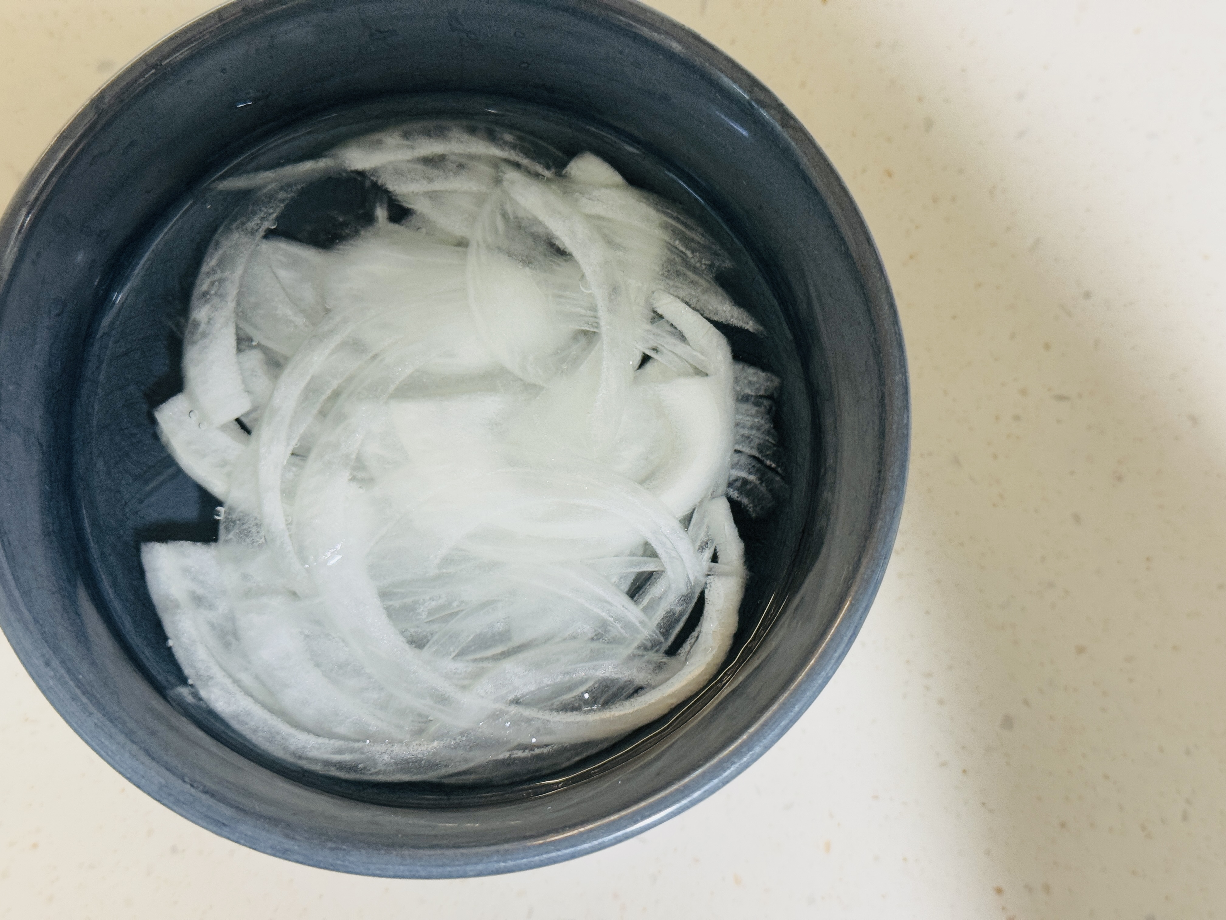 양파는 얇게 채썰어 찬물에 담궈 매운맛을 제거해 줍니다.