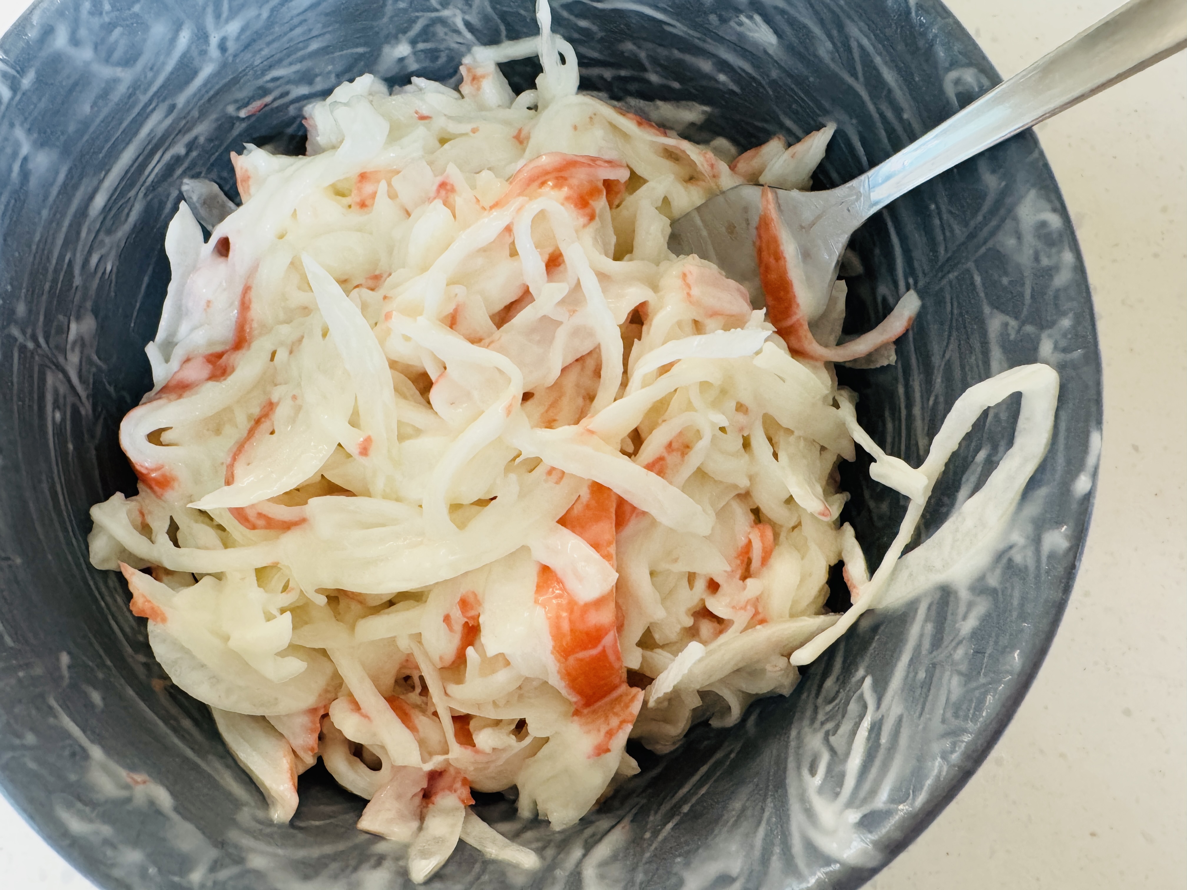 양파의 물기를 제거하고 마요네즈 2.5T 알룰로스 1t와 함께 크래미에 넣어주세요.