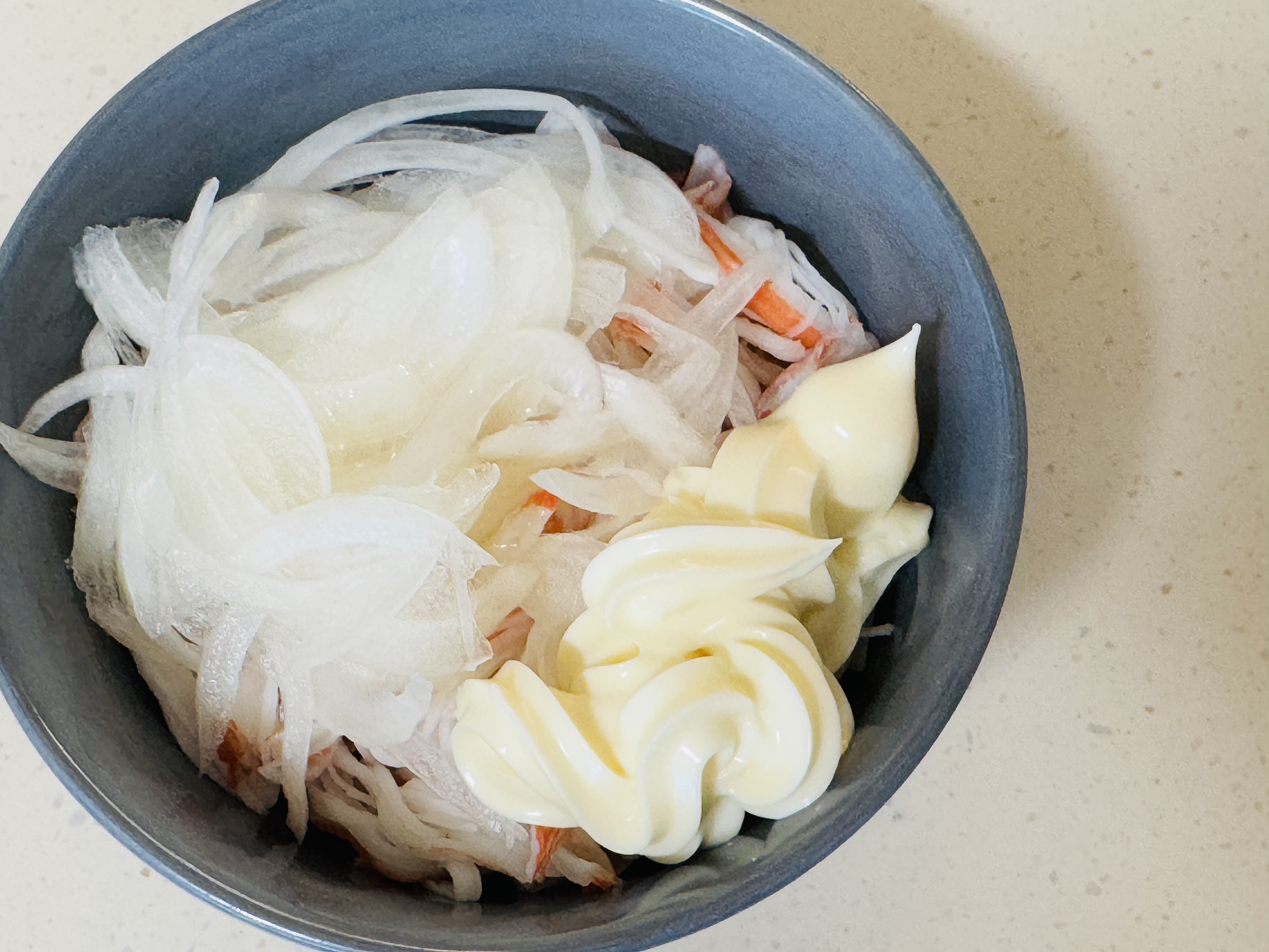 양파의 물기를 제거하고 마요네즈 2.5T 알룰로스 1t와 함께 크래미에 넣어주세요.