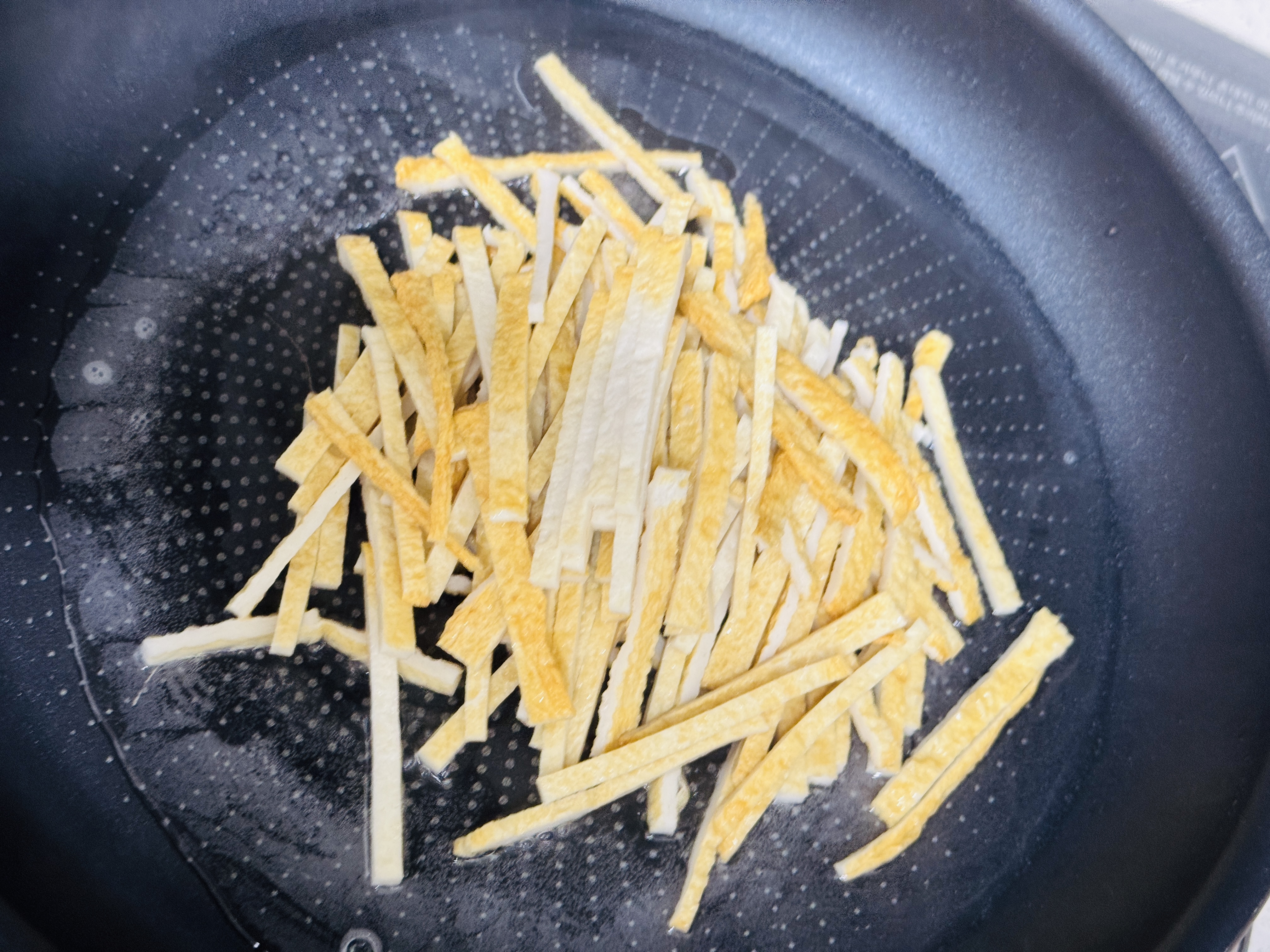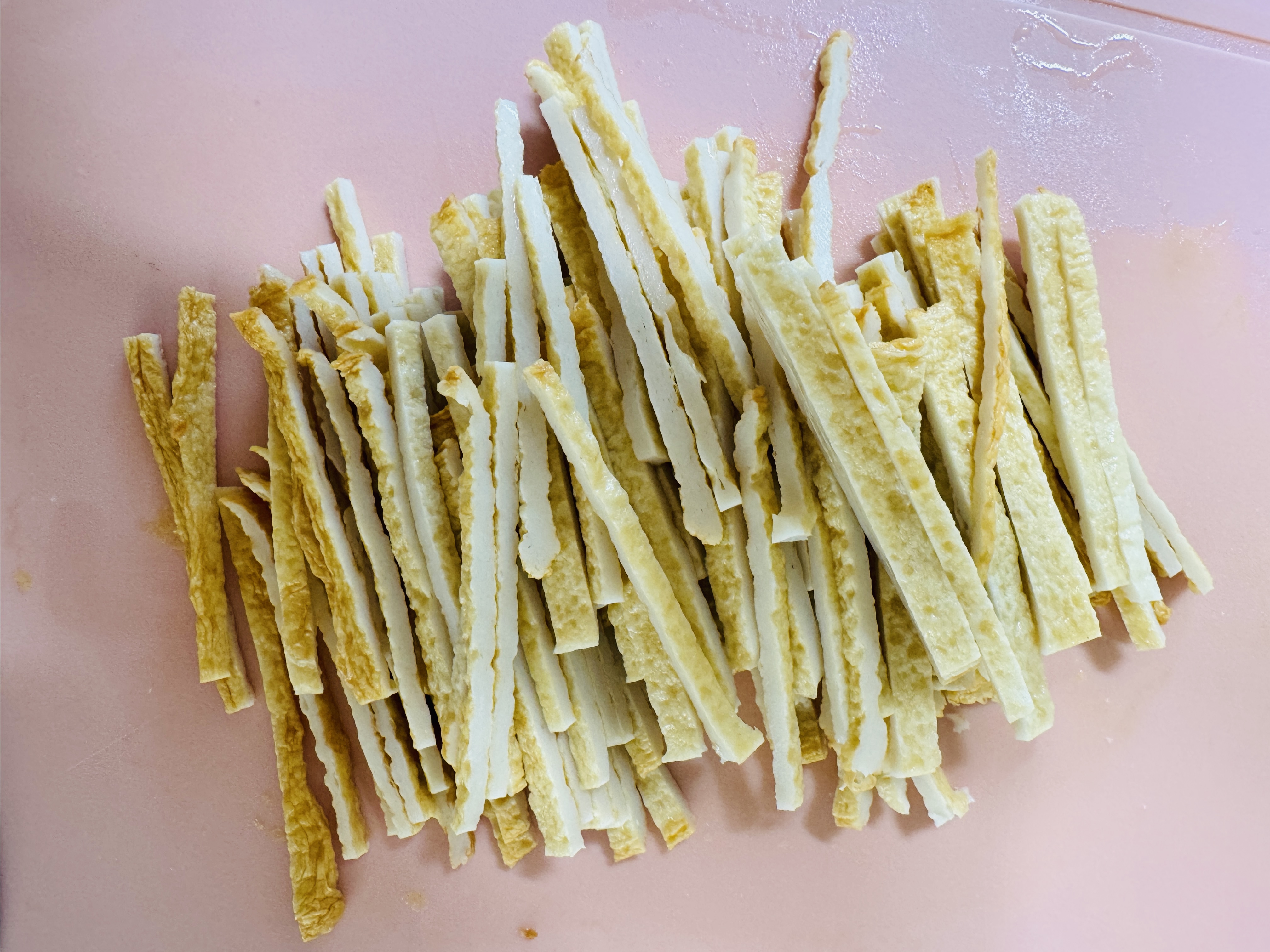 사각 어묵은 3등분 후 길게 채썰어 준비해 주세요.