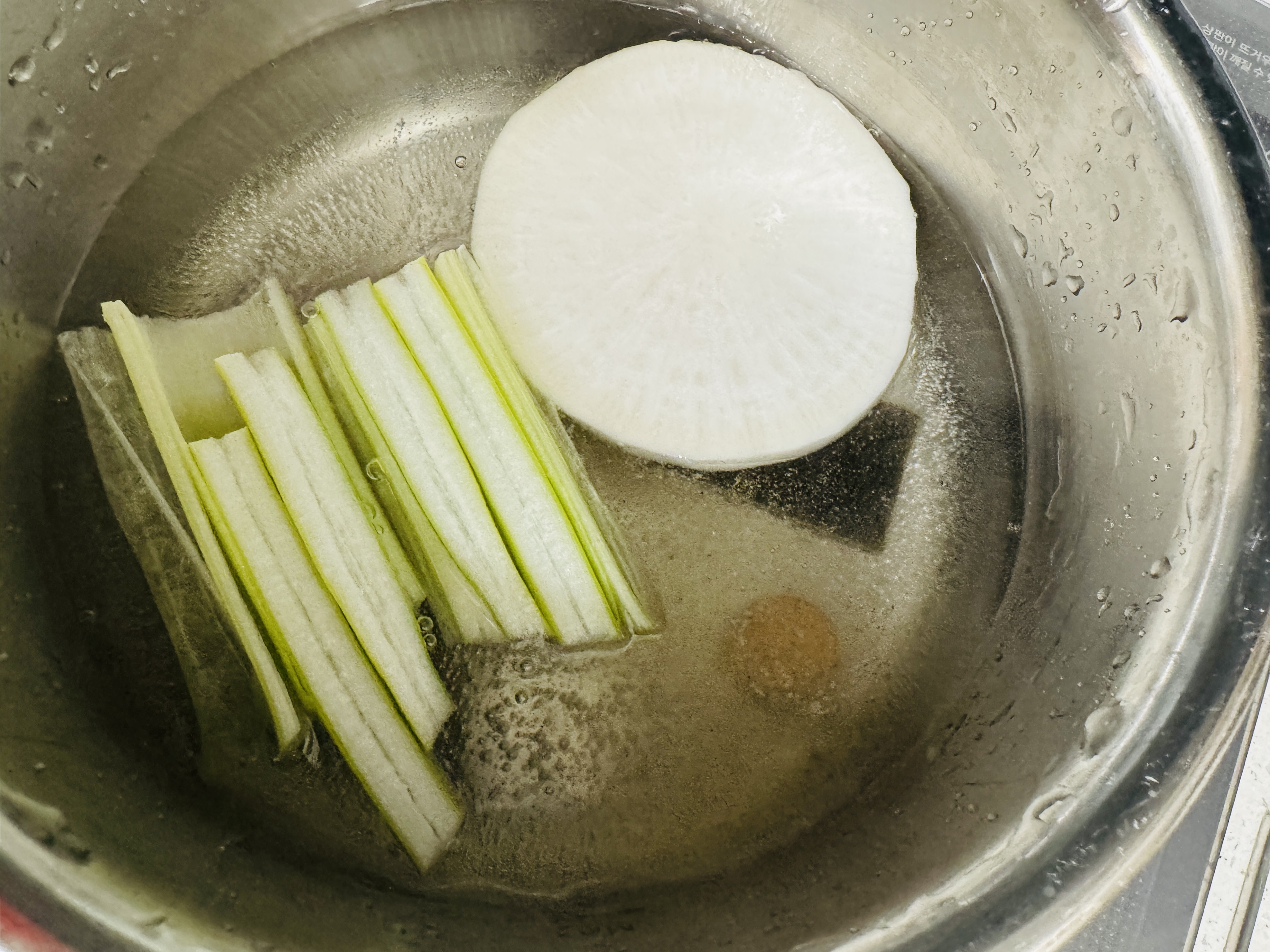 국수는 국물이 중요하기 때문에 코인 육수 + 무, 대파, 다시마처럼 국물 낼때 사용하는 재료들을 더 넣어 끓어주었어요. 국간장으로 간 맞춰주니 확실히 더 맛있더라고요☺️