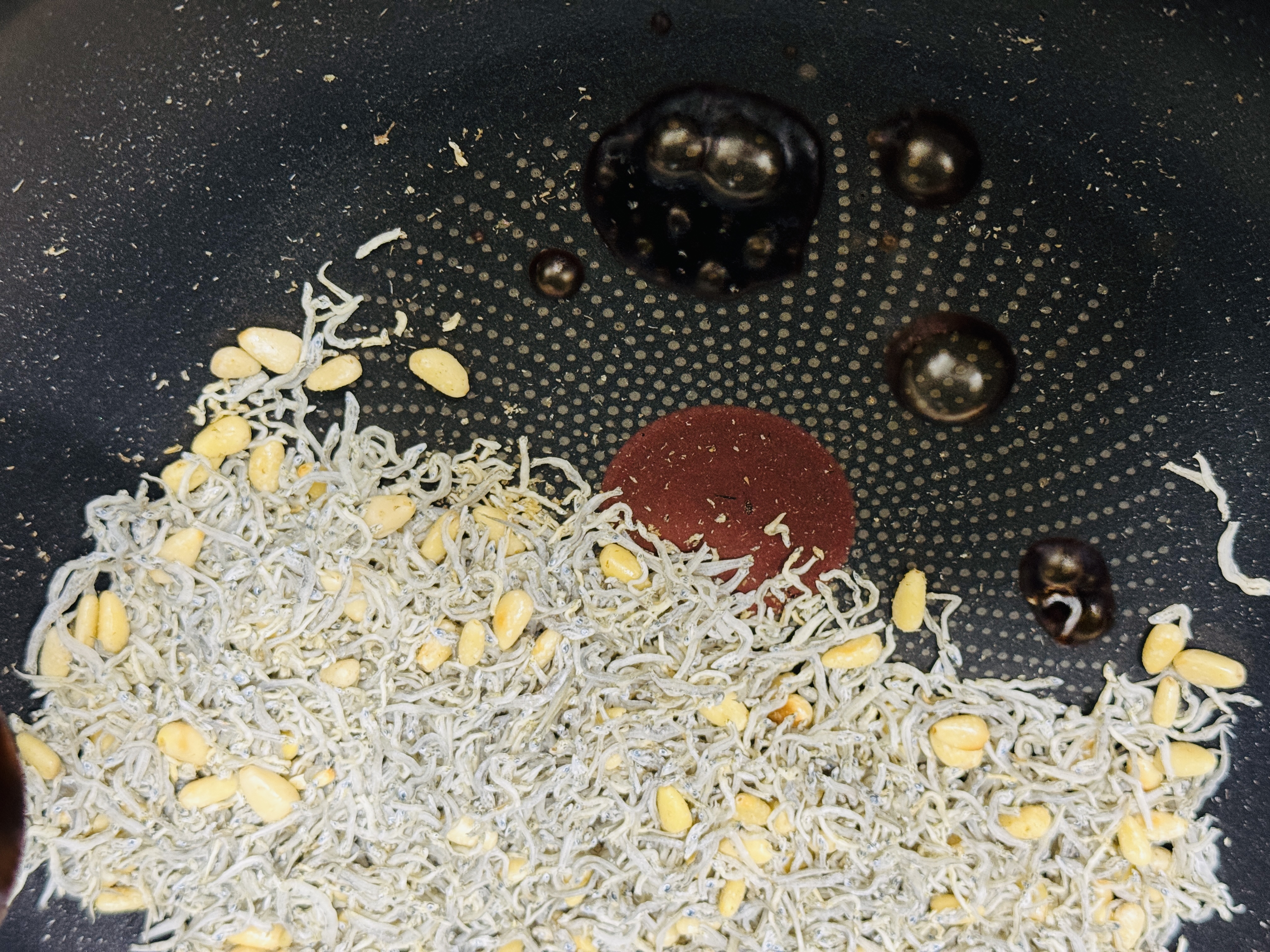 멸치를 팬 한쪽으로 몰아 놓고 간장 반스푼 넣어 끓으면 바로 멸치와 섞어주세요.