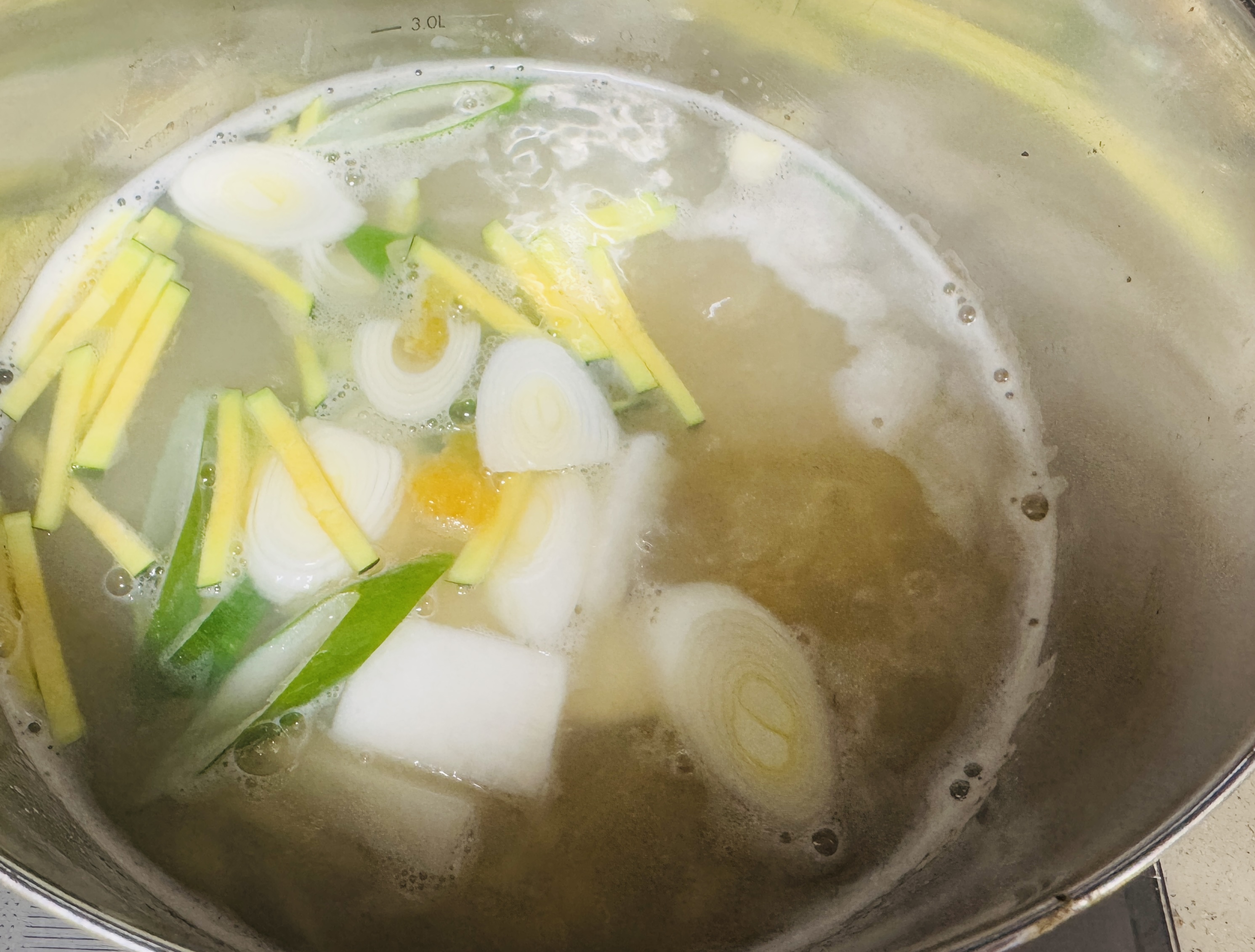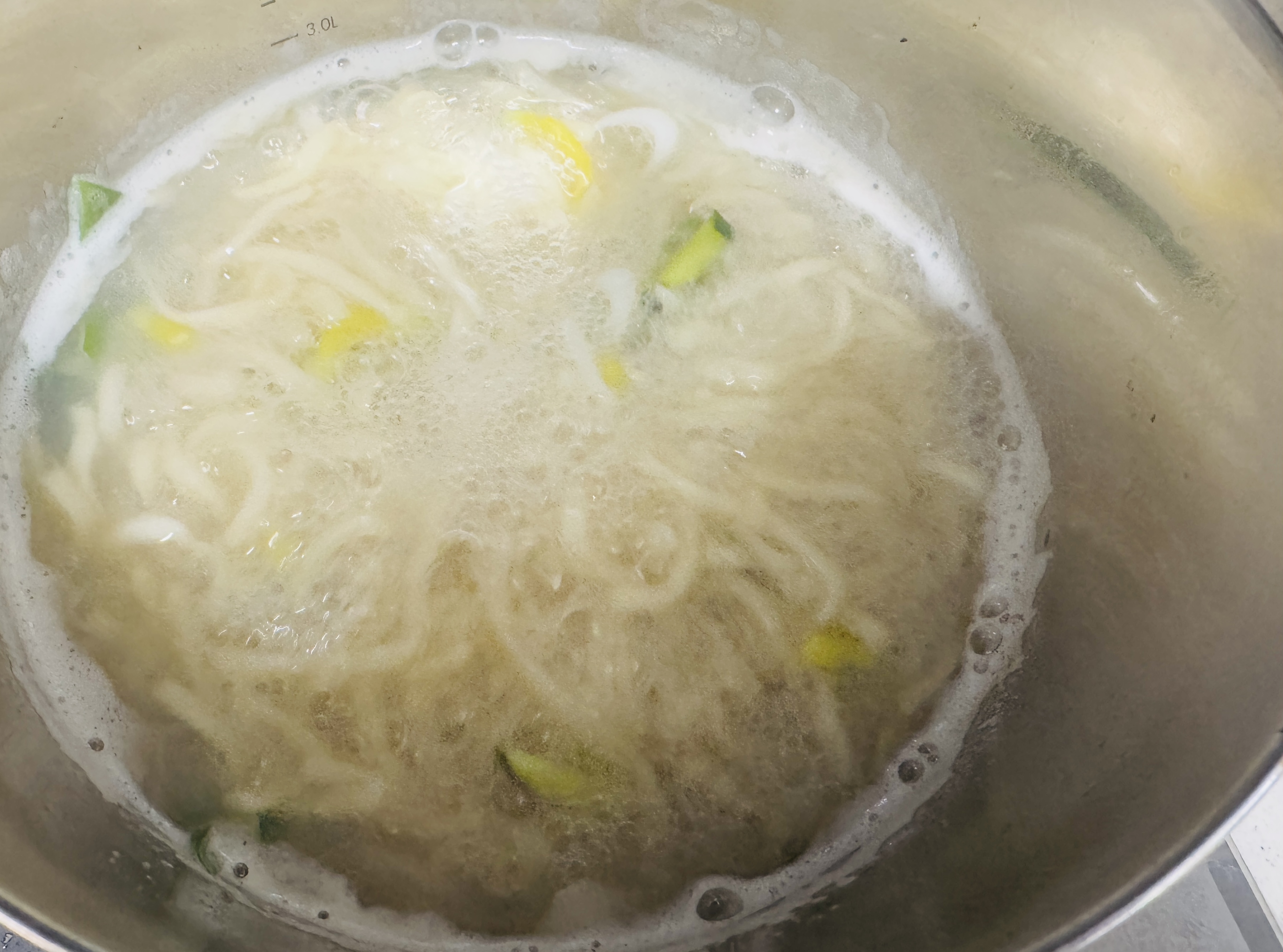 조개육수가 잘 우러나 짭짤했지만 칼국수는 물을 많이 흡수해 물을 조금 추가하고 소금 조금 넣어 간을 맞춰주었어요. 미리 손질해둔 야채와 다진마늘 넣고 면은 물에 헹궈 넣어주었어요.