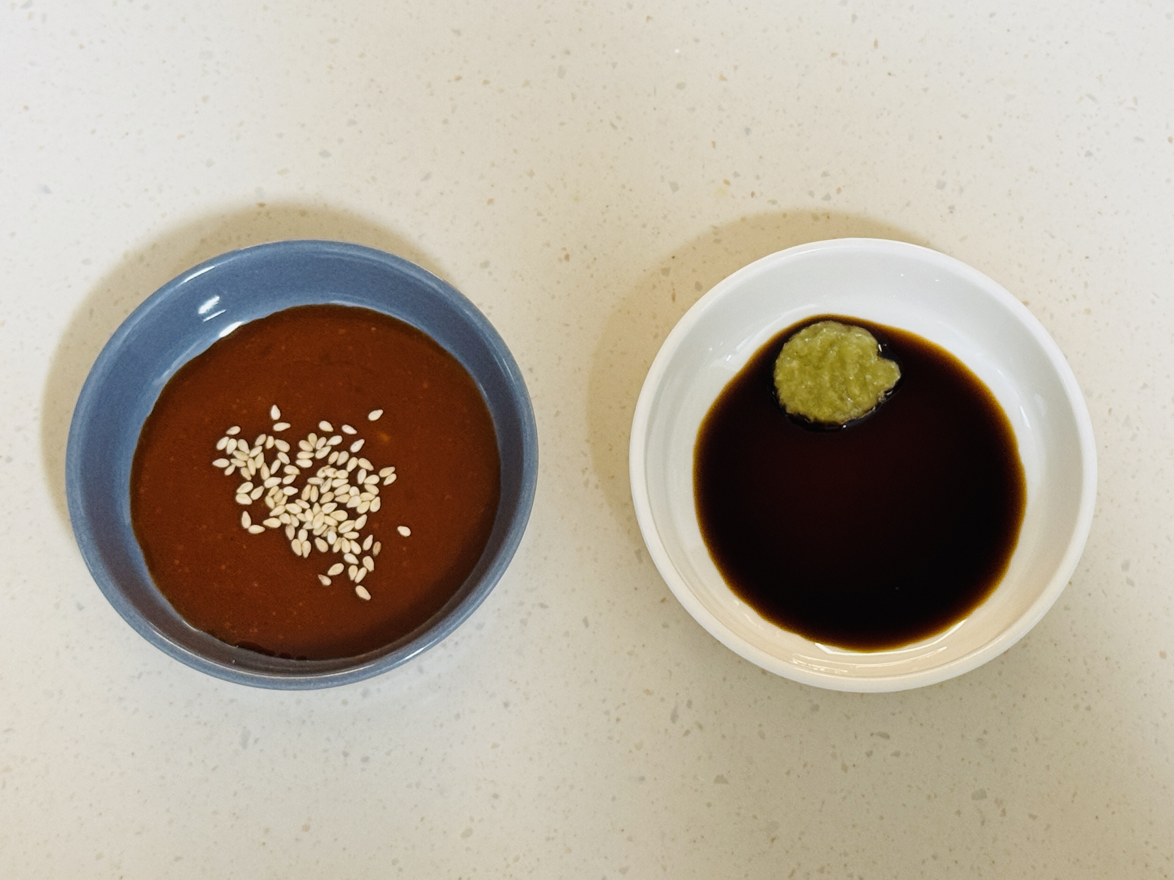 소스는 초장 소스, 와시비 간장 소스 두가지 준비했어요. 아이는 소스 없이도 짭짤해서인지 잘 먹더라고요.