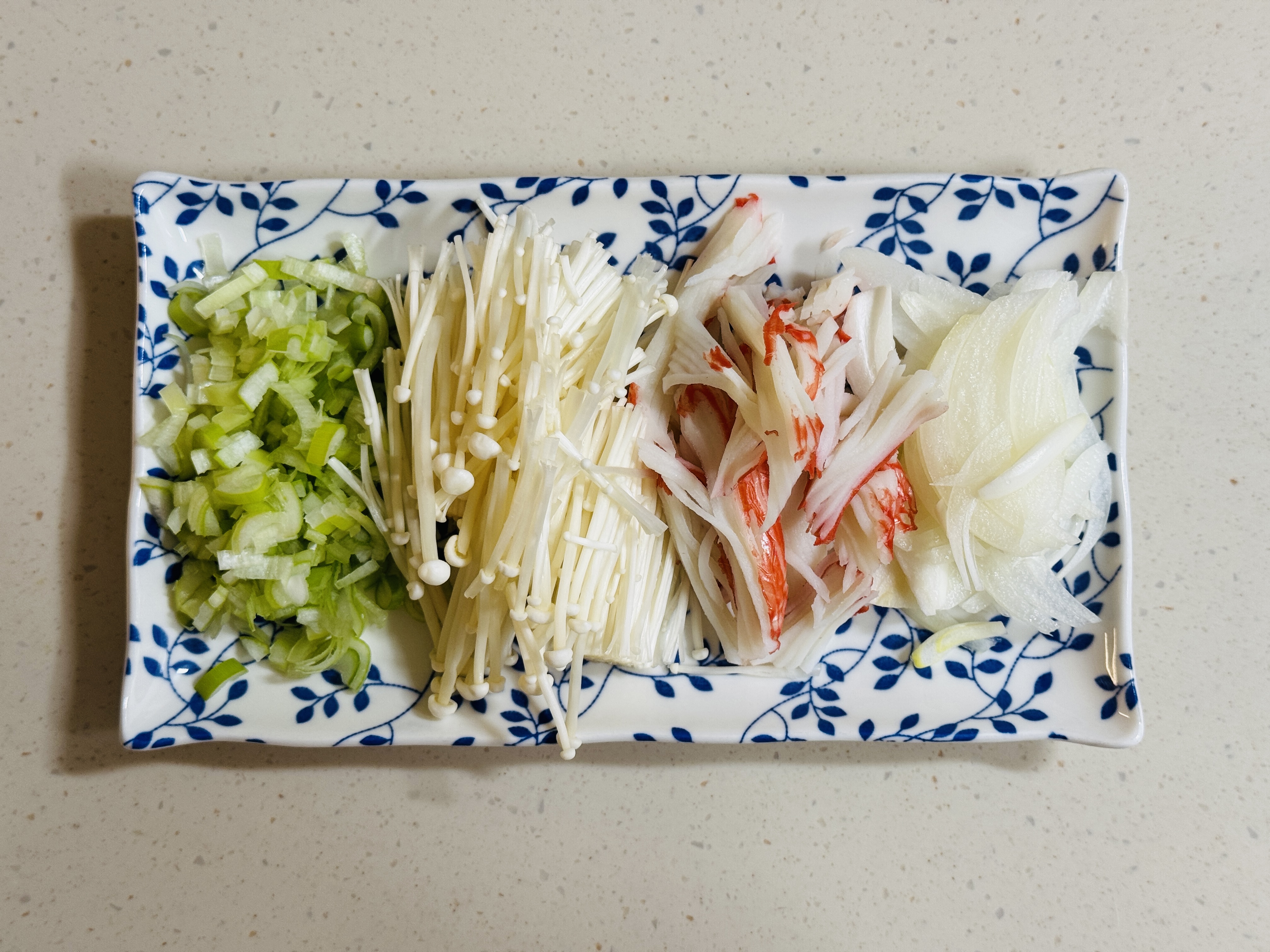 파는 잘게 다져 준비하고 팽이버섯은 길이 맞춰 잘라주세요. 크레미는 결대로 찢고 양파는 얇게 채썰어 준비해 주세요:)
