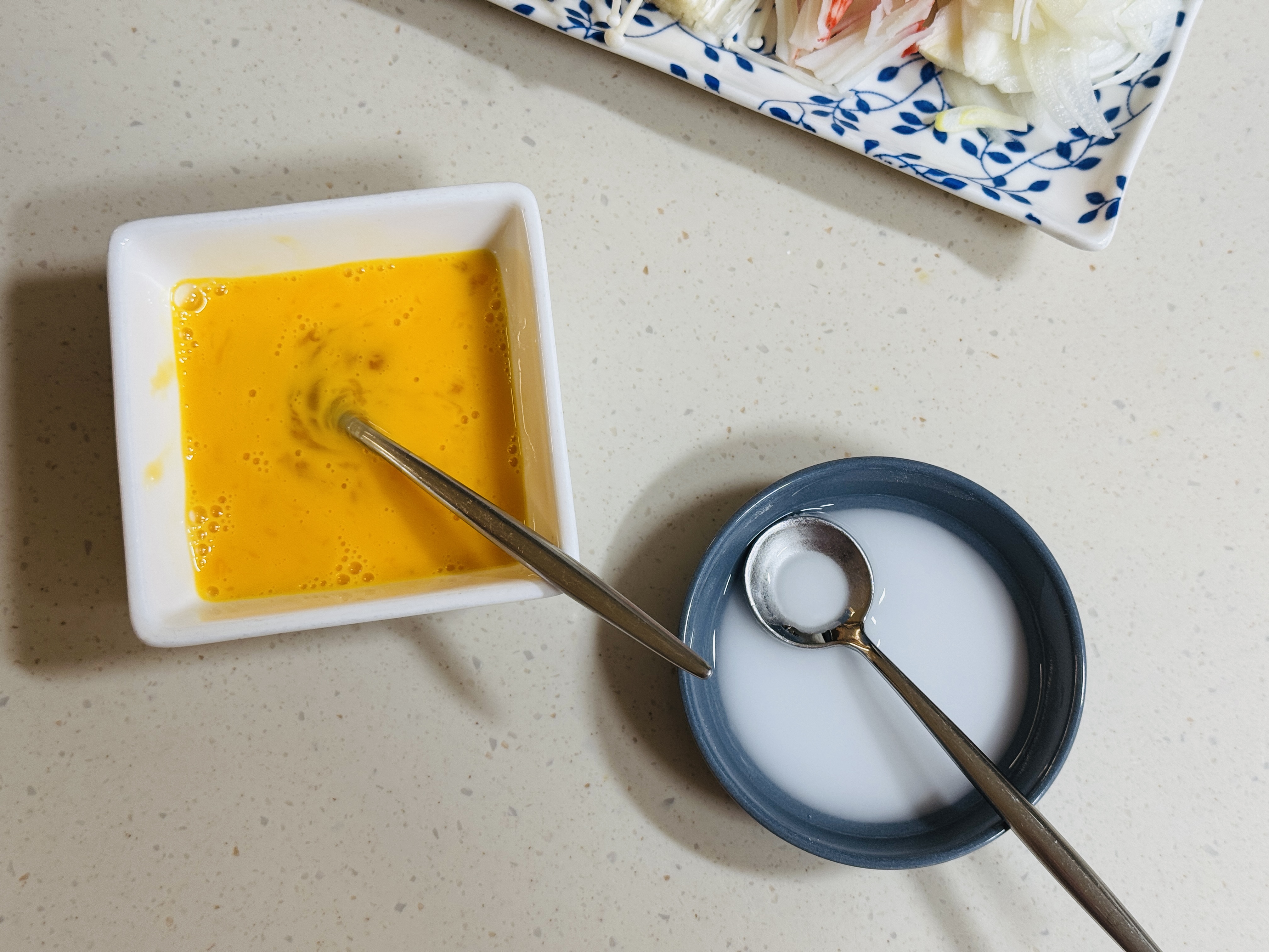 달걀은 풀어 준비해 놓고 전분에는 물을 넣어 섞어놓아 주세요.