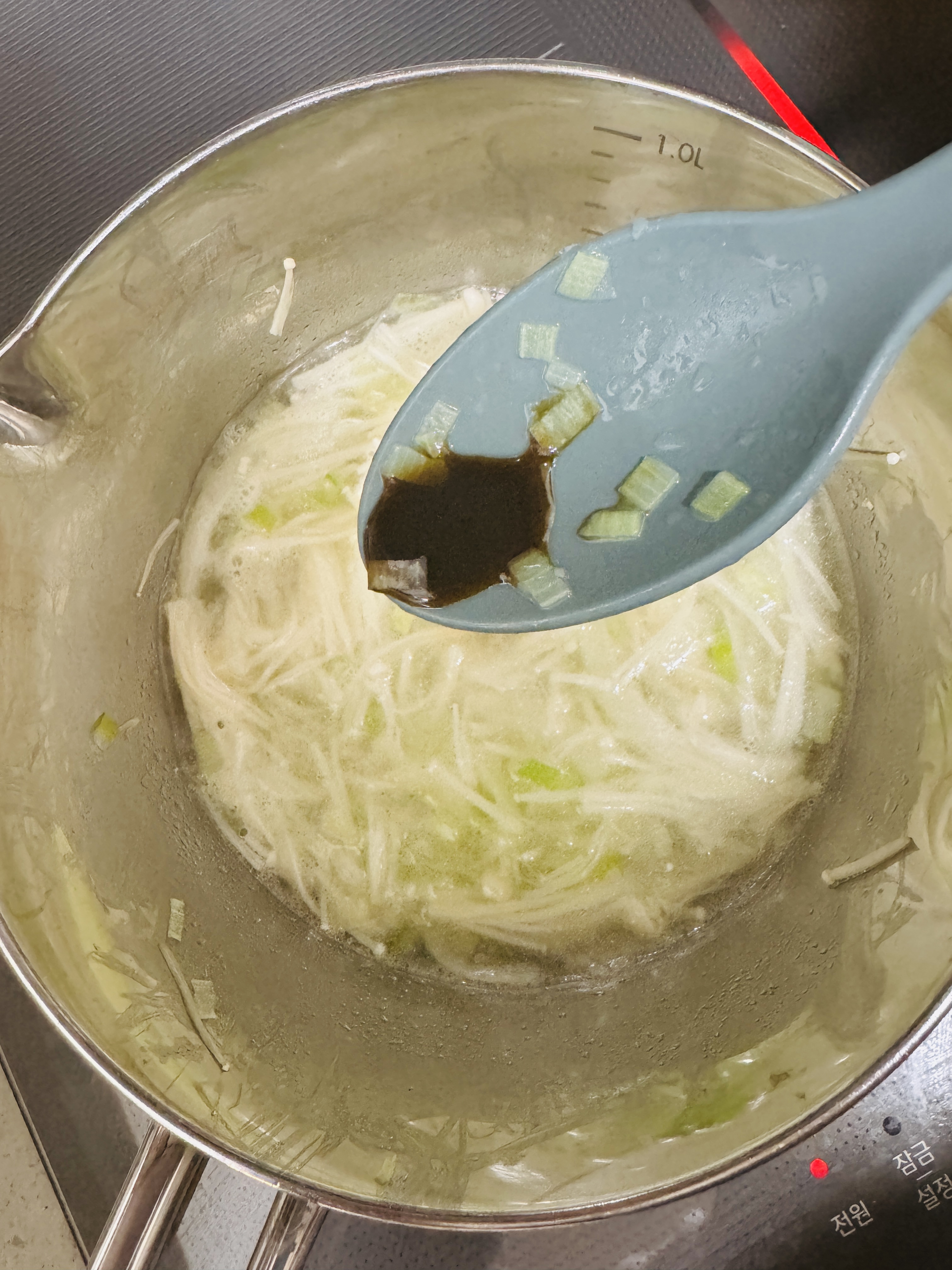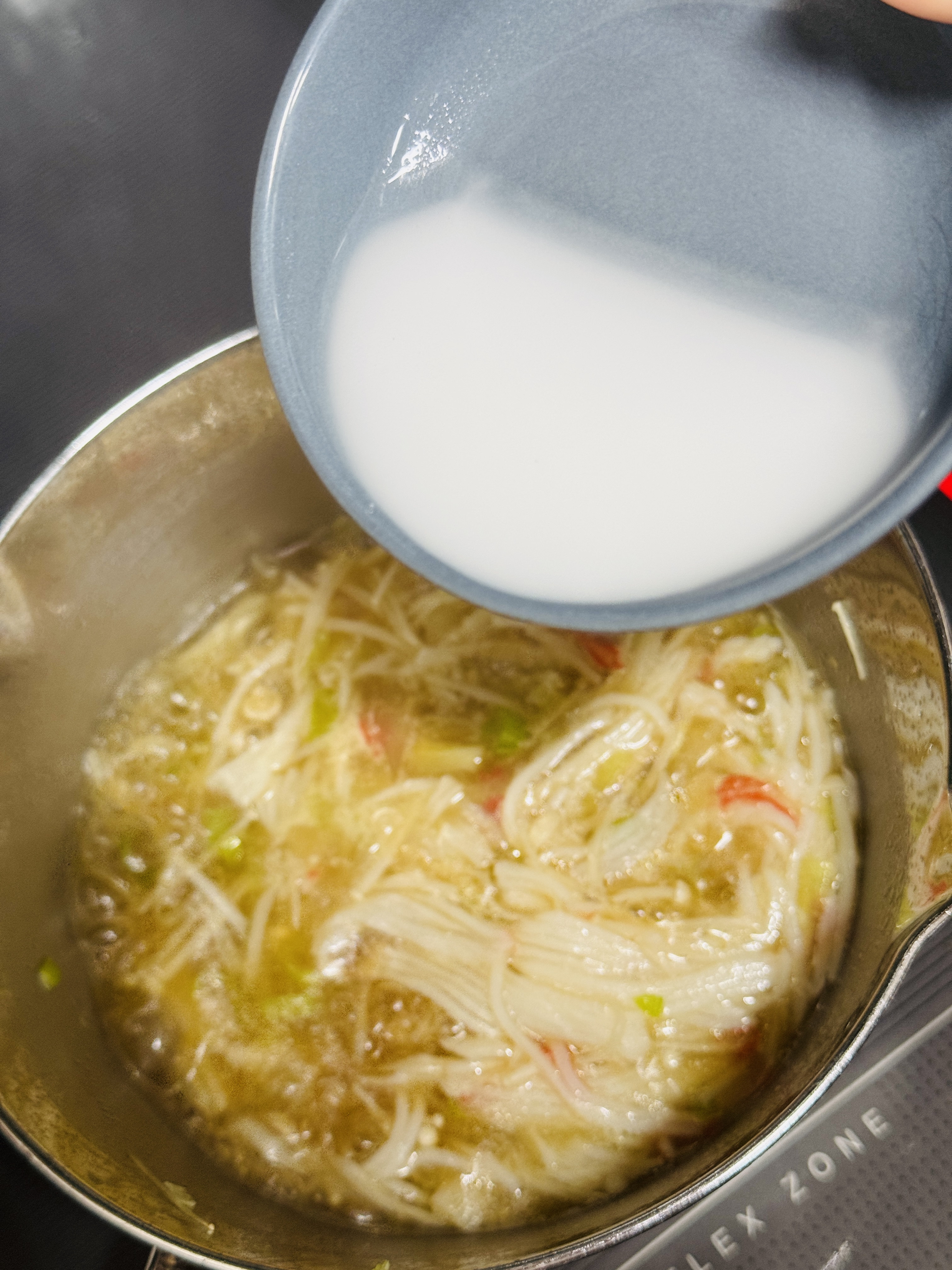 물과 섞어놓은 전분물을 부어 살짝 걸쭉하게 농도를 맞춰주세요. 달걀이 들어가면 조금 더 걸쭉해 지니 그 부분 생각해서 농도 맞춰주세요.