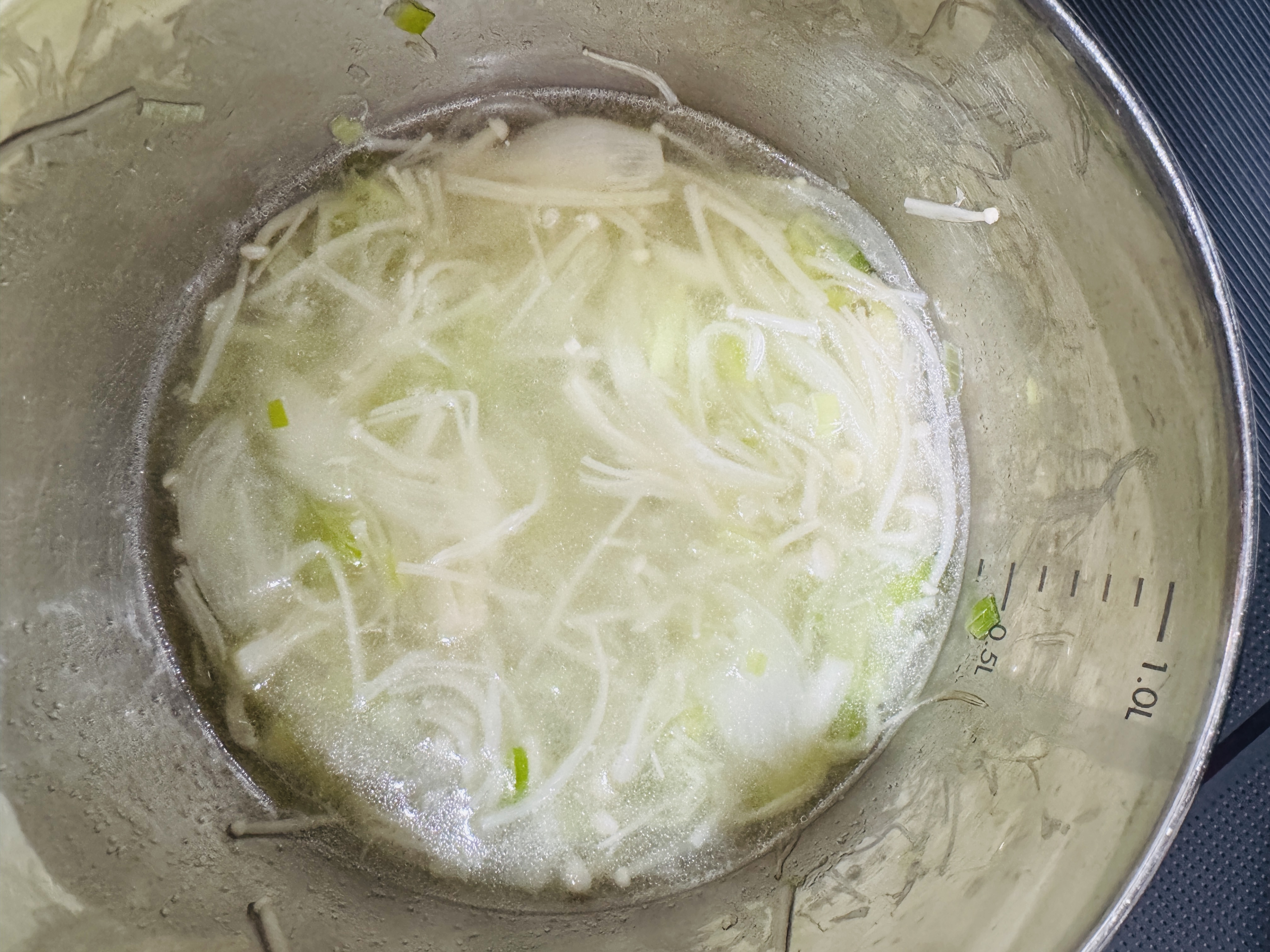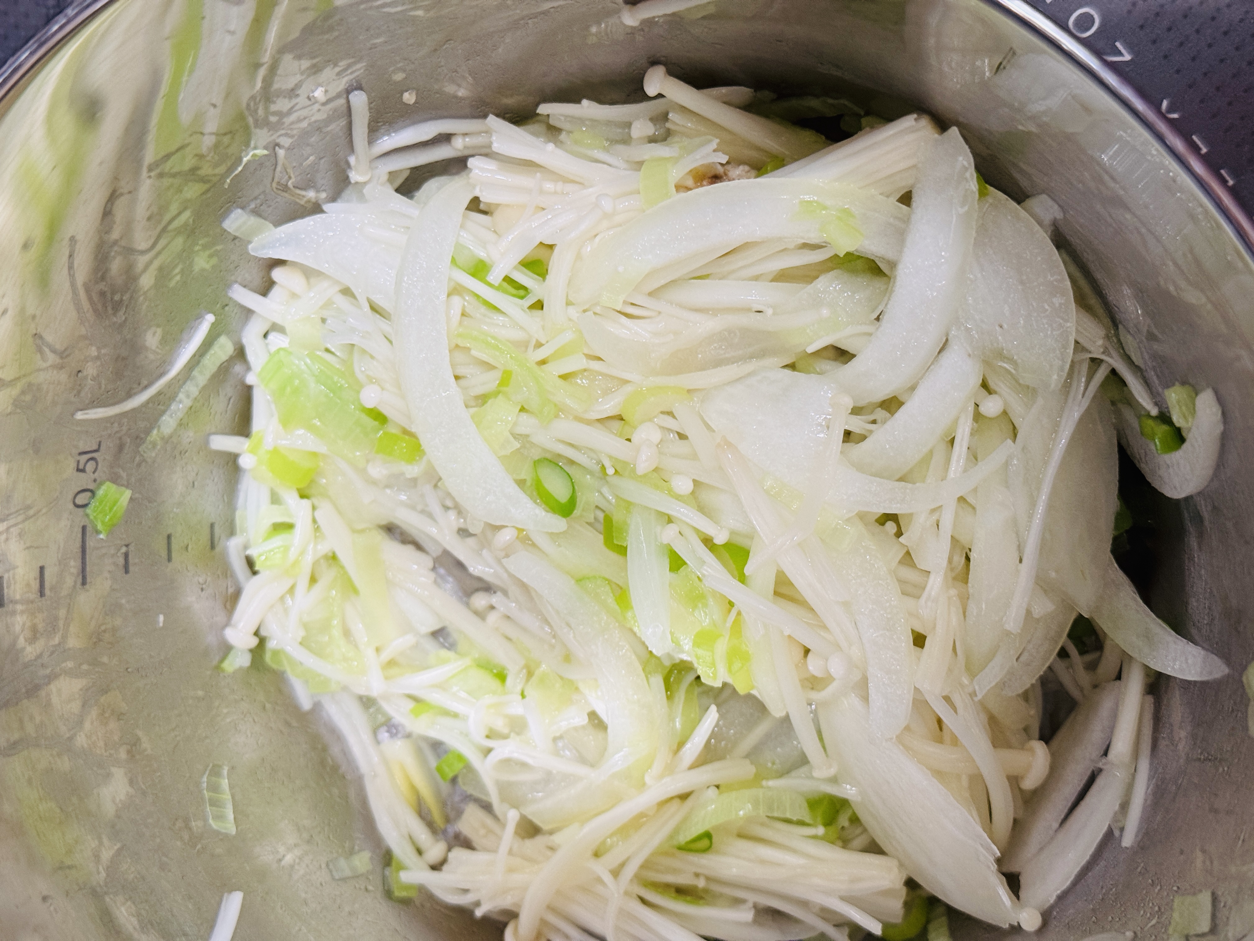 향이 올라오면 팽이버섯과 양파를 넣어 볶아주세요.