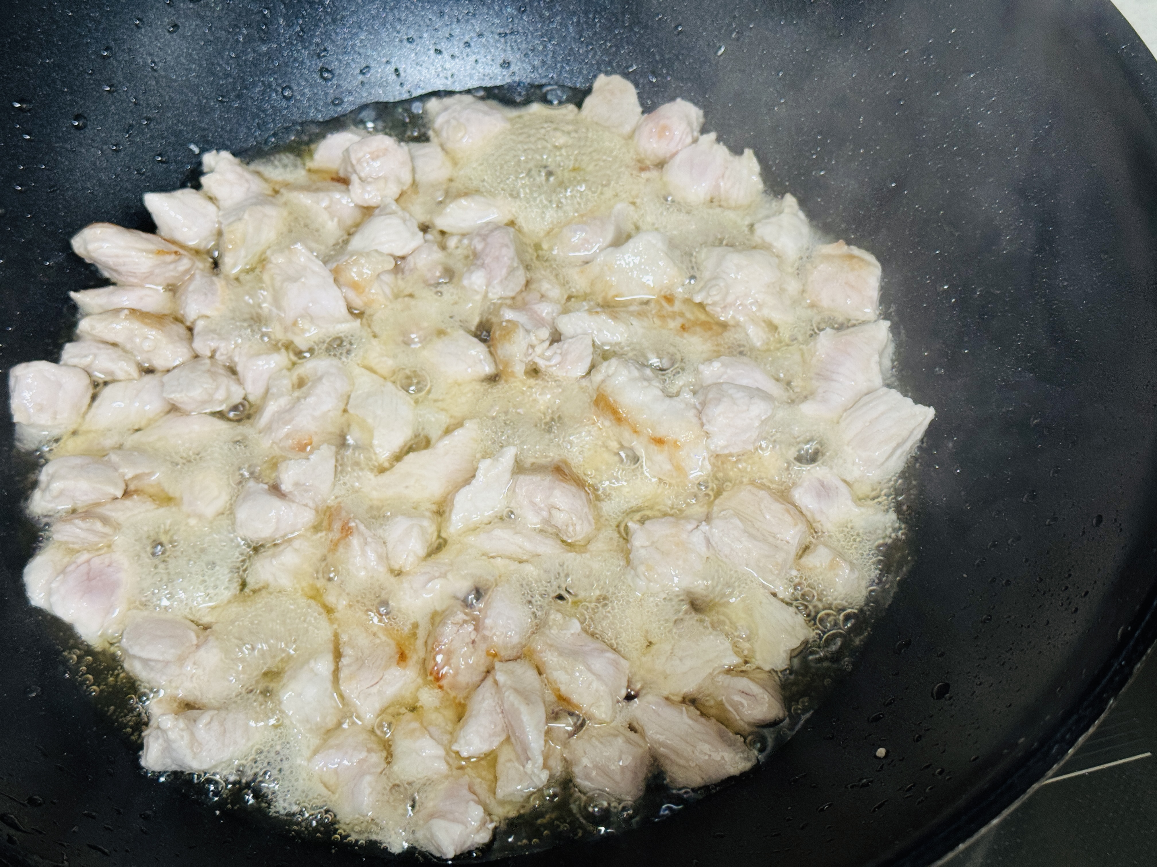 펜에 기름 12T넣어 달궈준 뒤 중불에서 돼지고기 넣어 3분 볶아주세요.