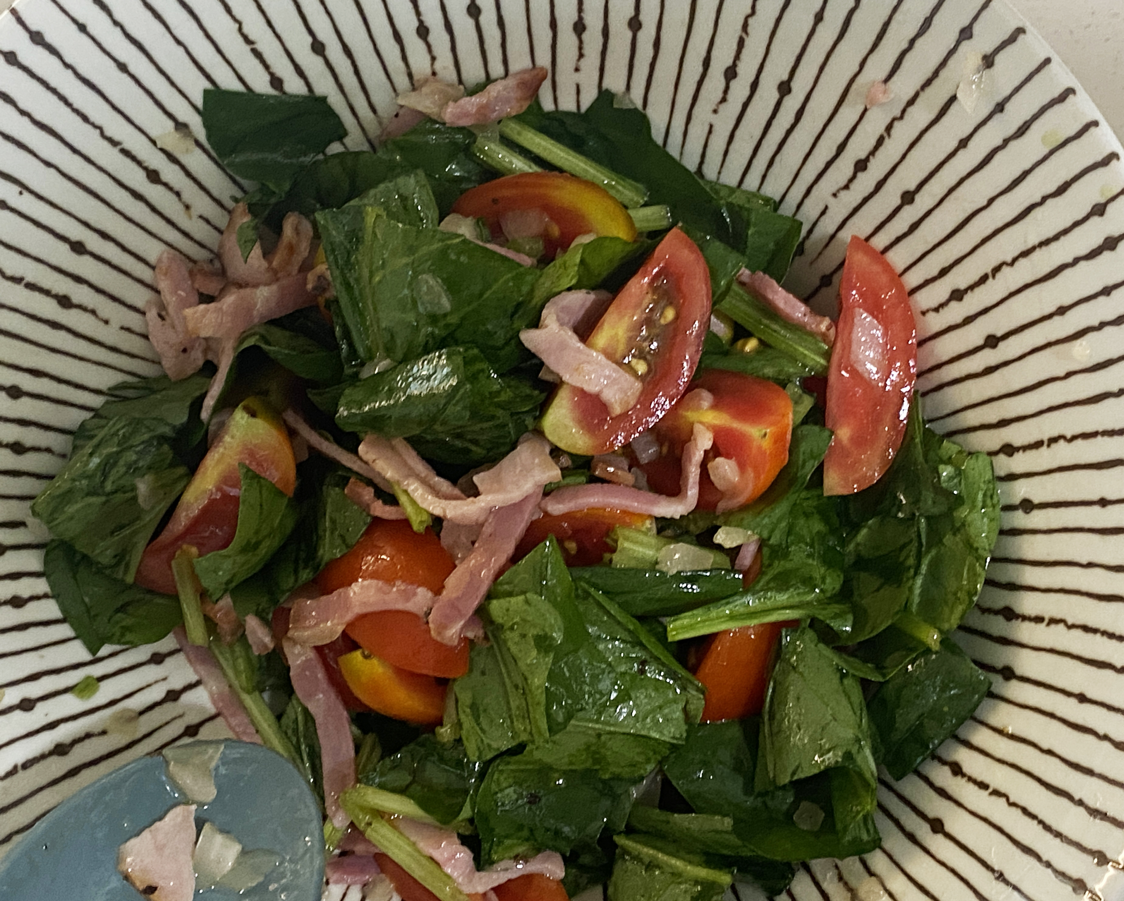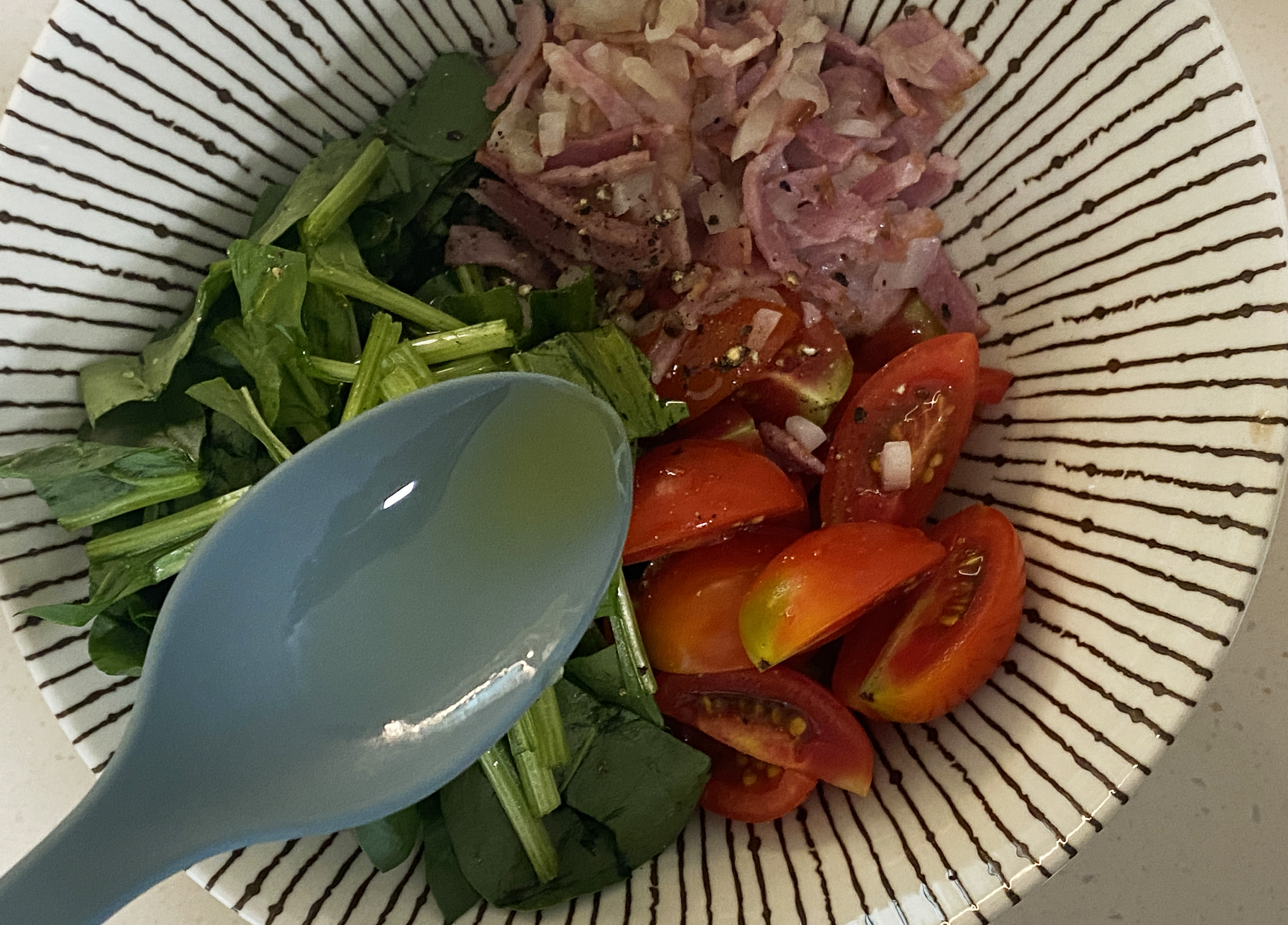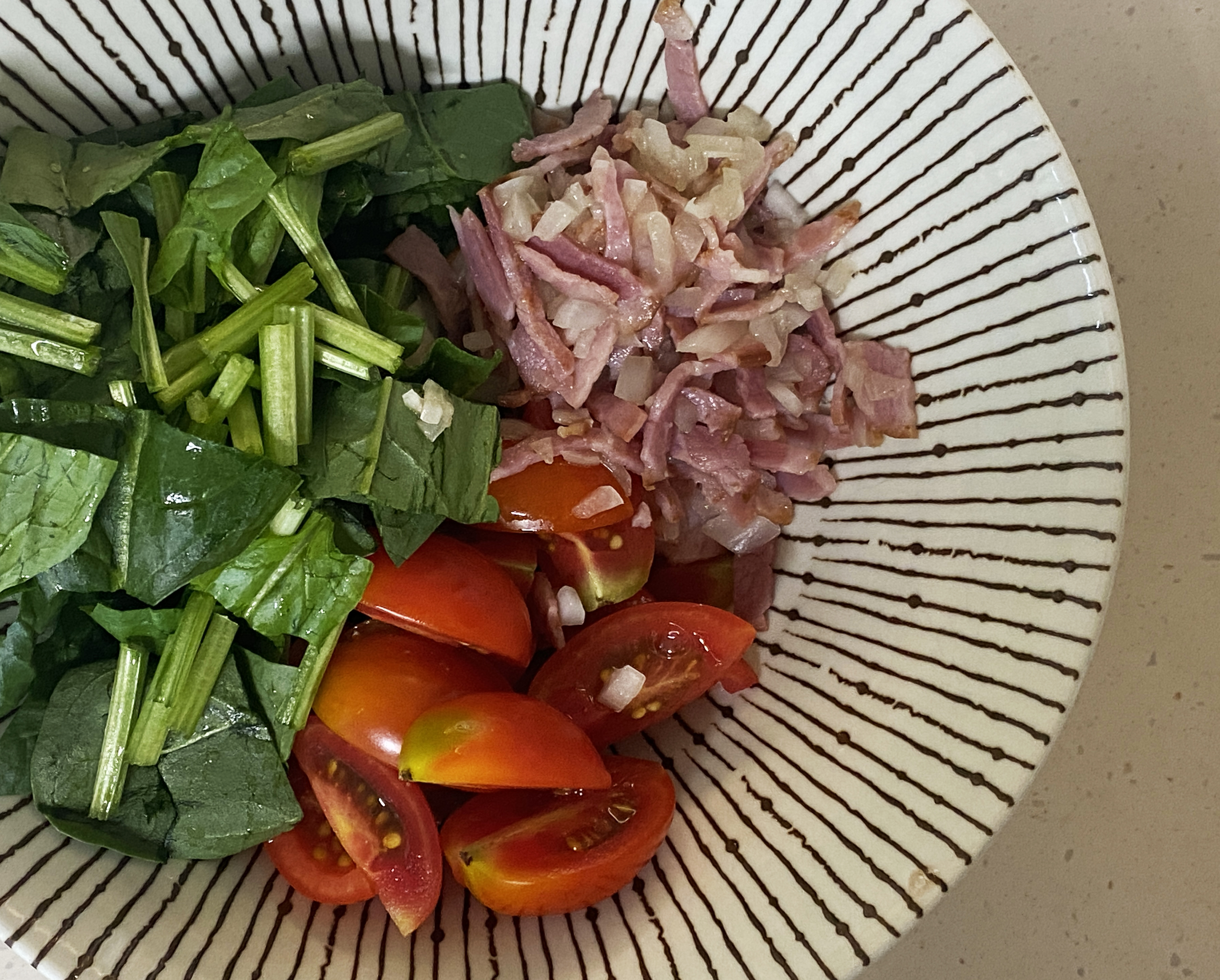 볼에 시금치, 토마토, 베이컨과 양파를 넣은 뒤