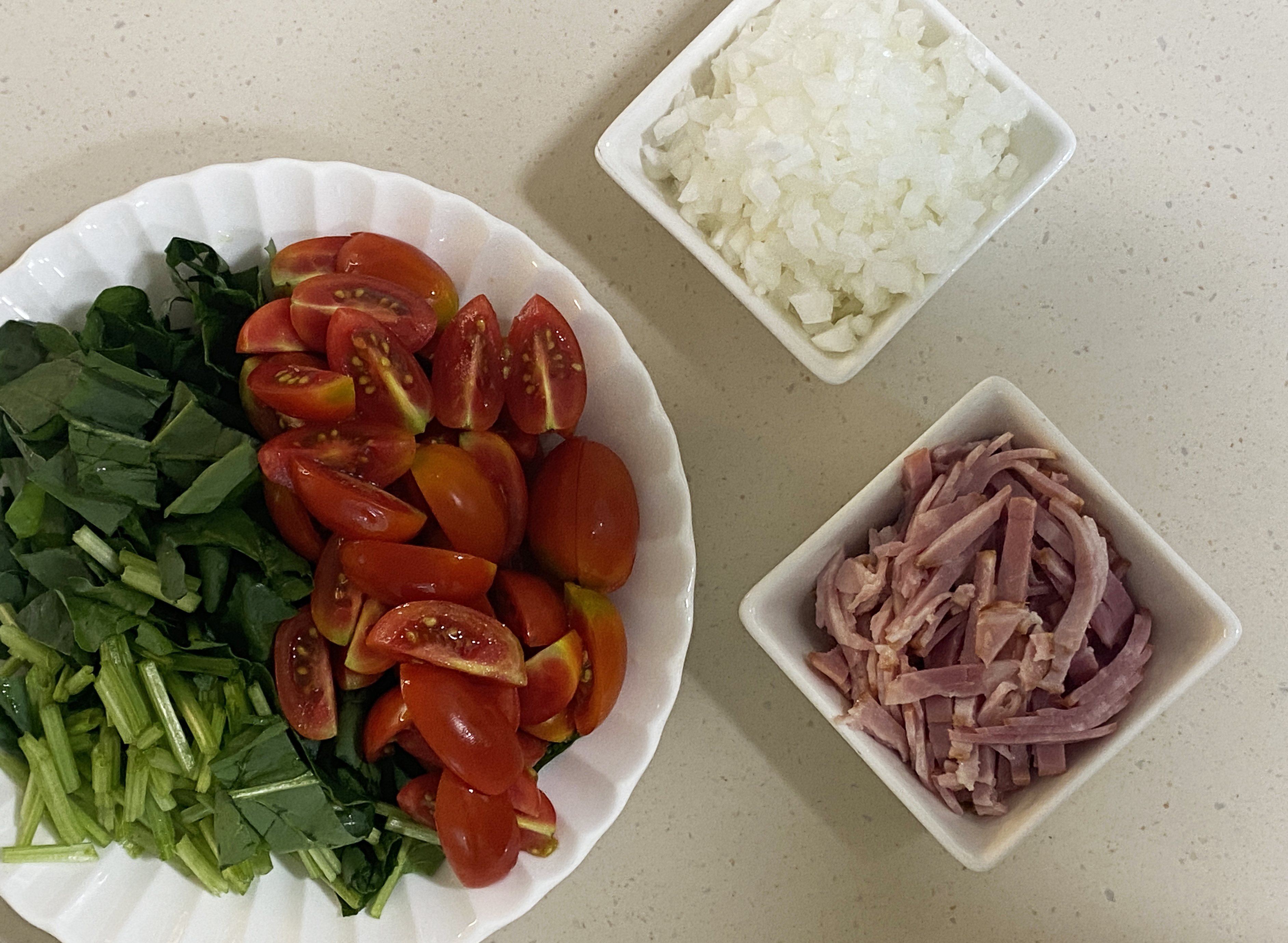 시금치, 토마토는 먹기 좋은 크기로 잘라주고 양파는 작게 다져주세요.