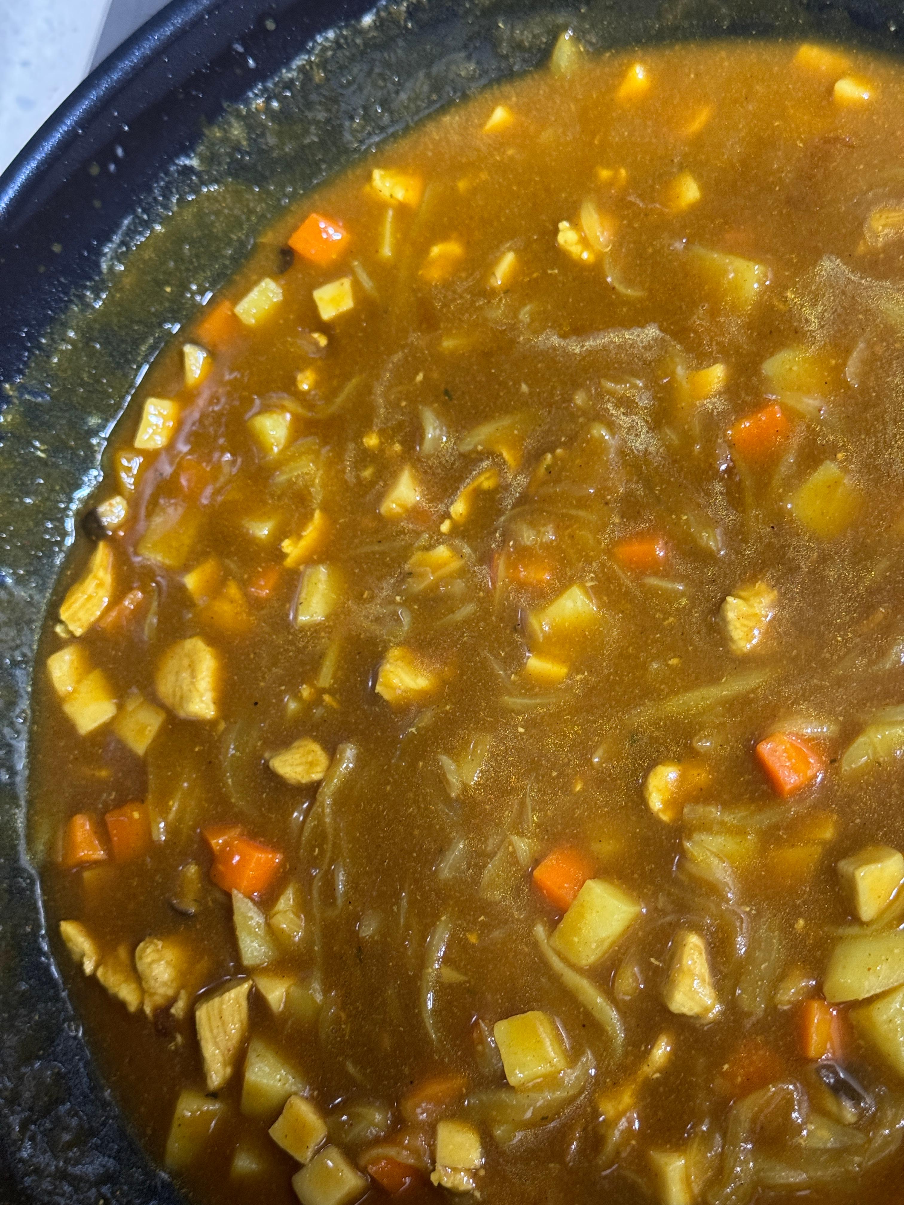야채가 잘 볶아지면 물 2컵 반과 육수 소스 넣어 끓여주세요. 여왕카레는 특이하게 소스 육수가 따로 들어있더라고요.. 그래서 더욱 깊은 맛이 나는 것 같아요:)