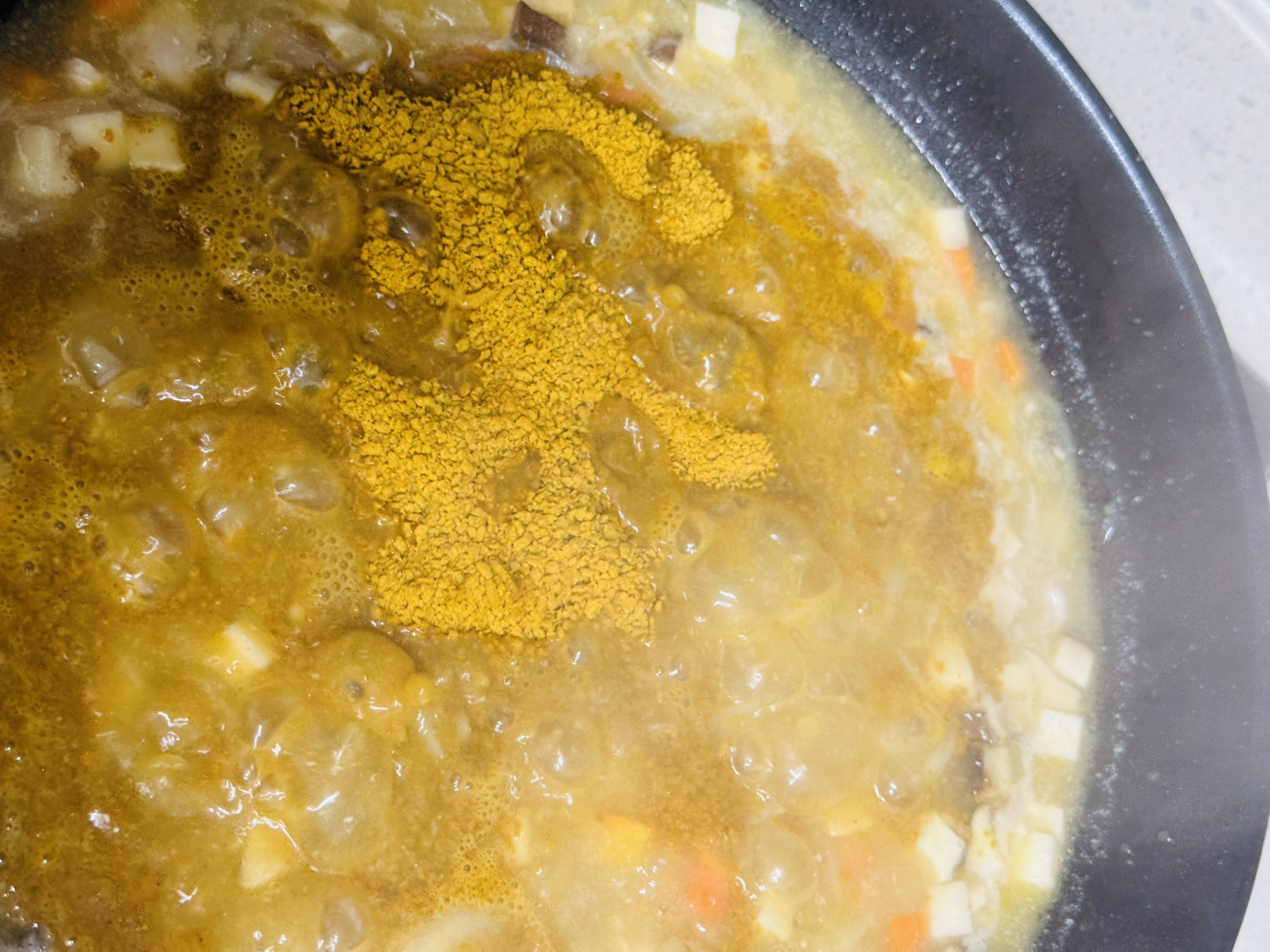 물이 끓으면 카레 가루 넣어 잘 휘져어가며 끓여주세요.