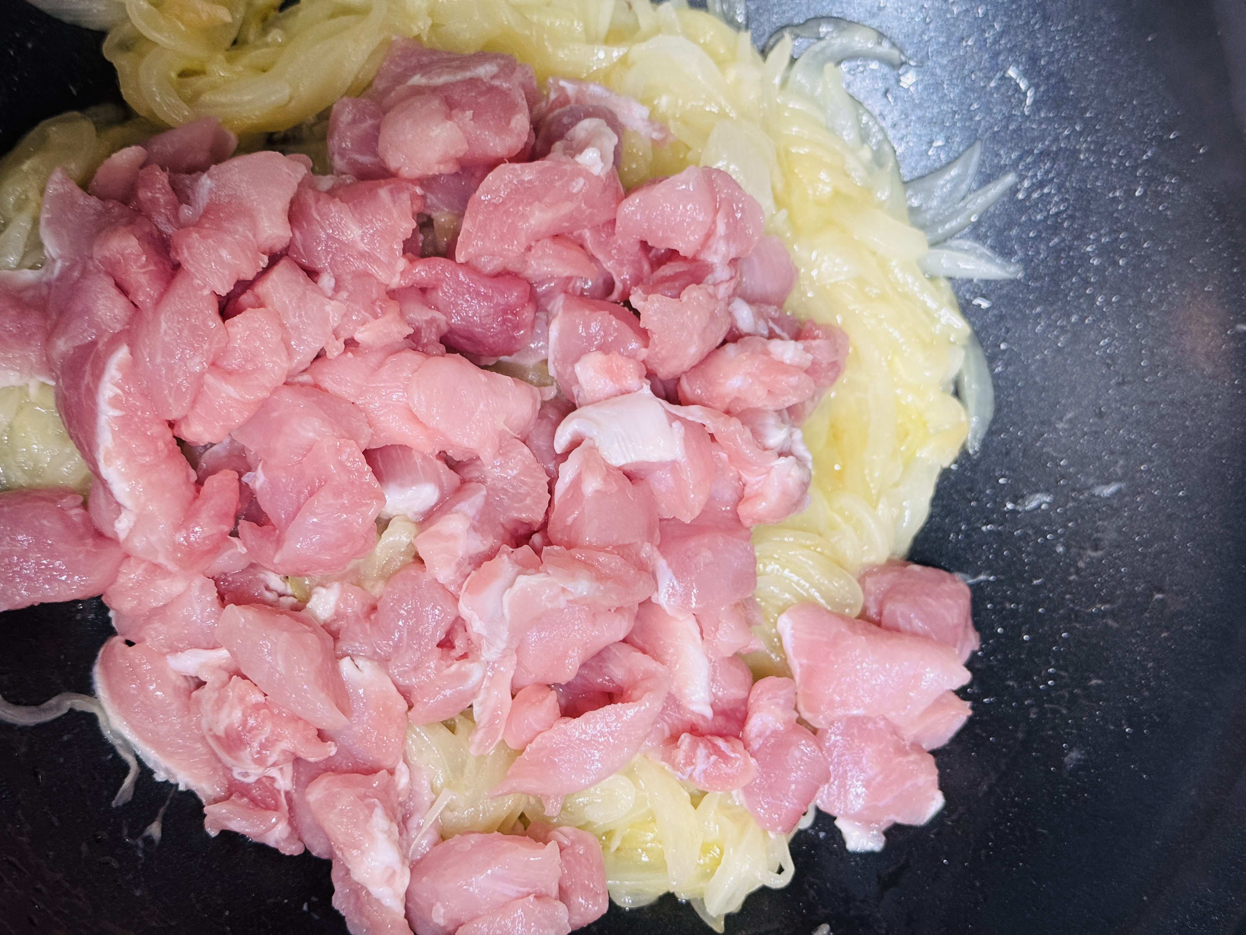 양파가 흐물흐물 잘 볶아지면 돼지고기 넣어 볶아주세요.