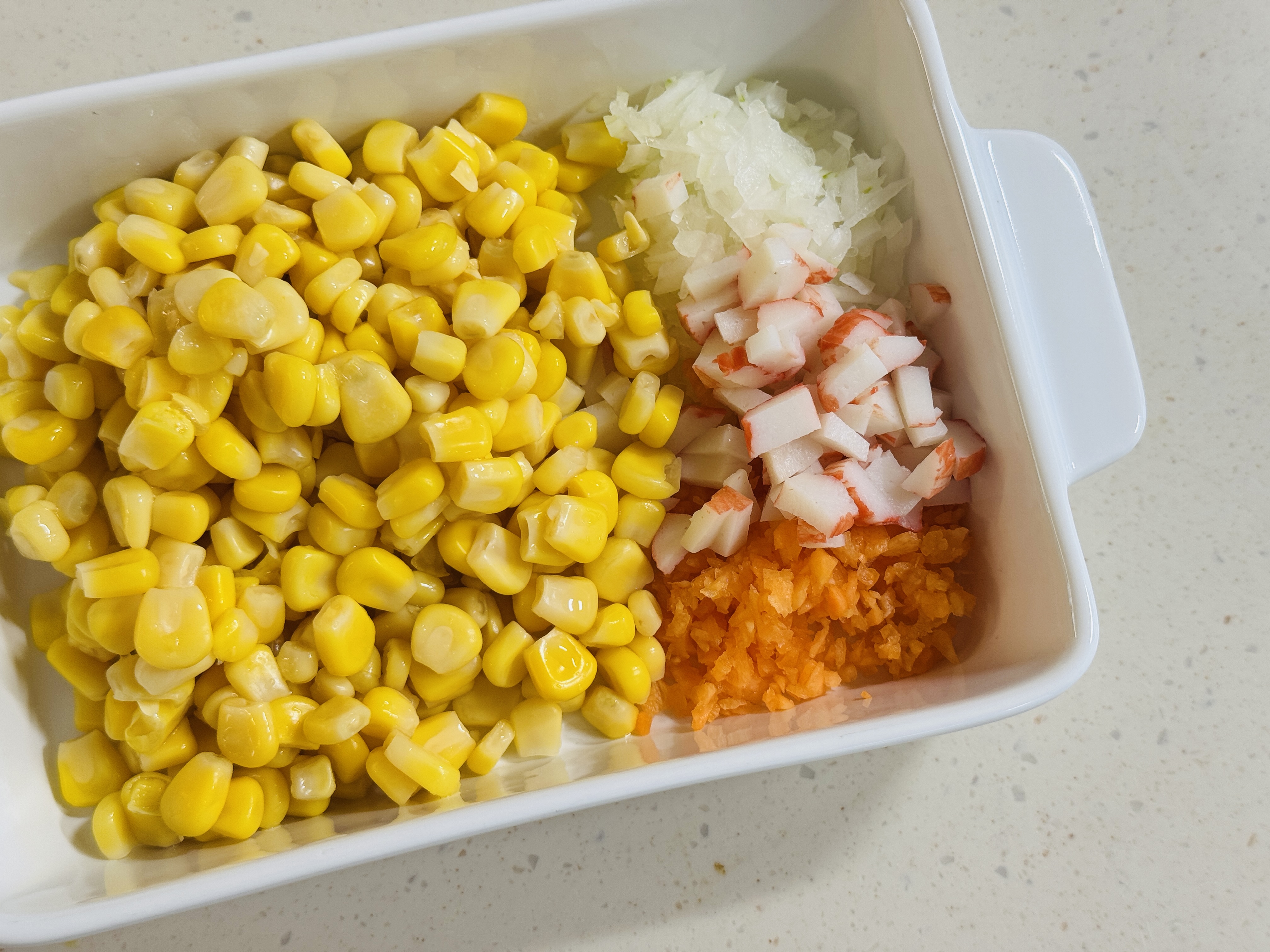 옥수수 통조림은 물기를 제거한 뒤 넣어주고 설탕1/2T 마요네즈 1T 넣어 잘 섞어주세요.
