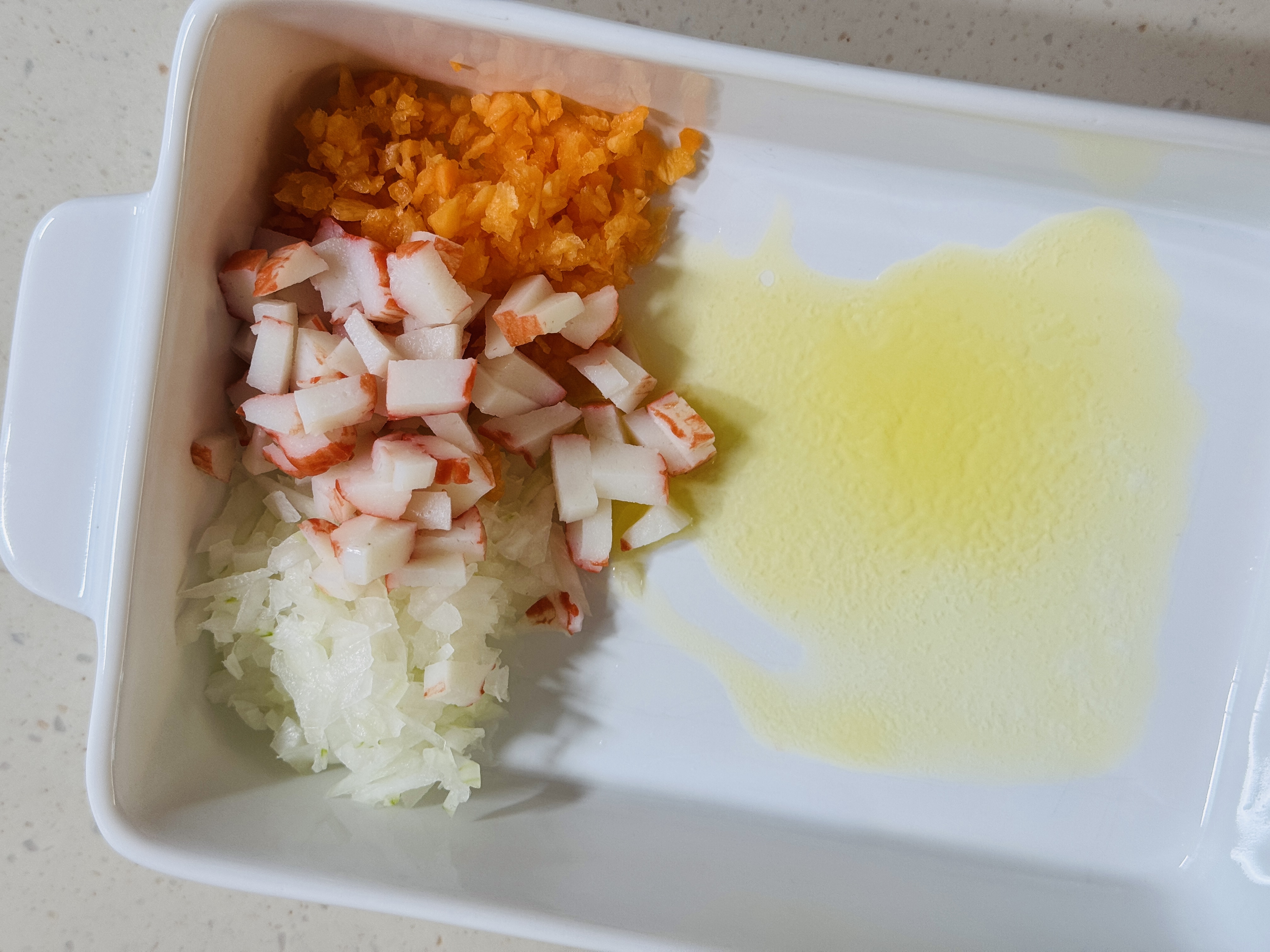 크래미는 양파와 당근보다는 크게 잘라 준비해 주세요.