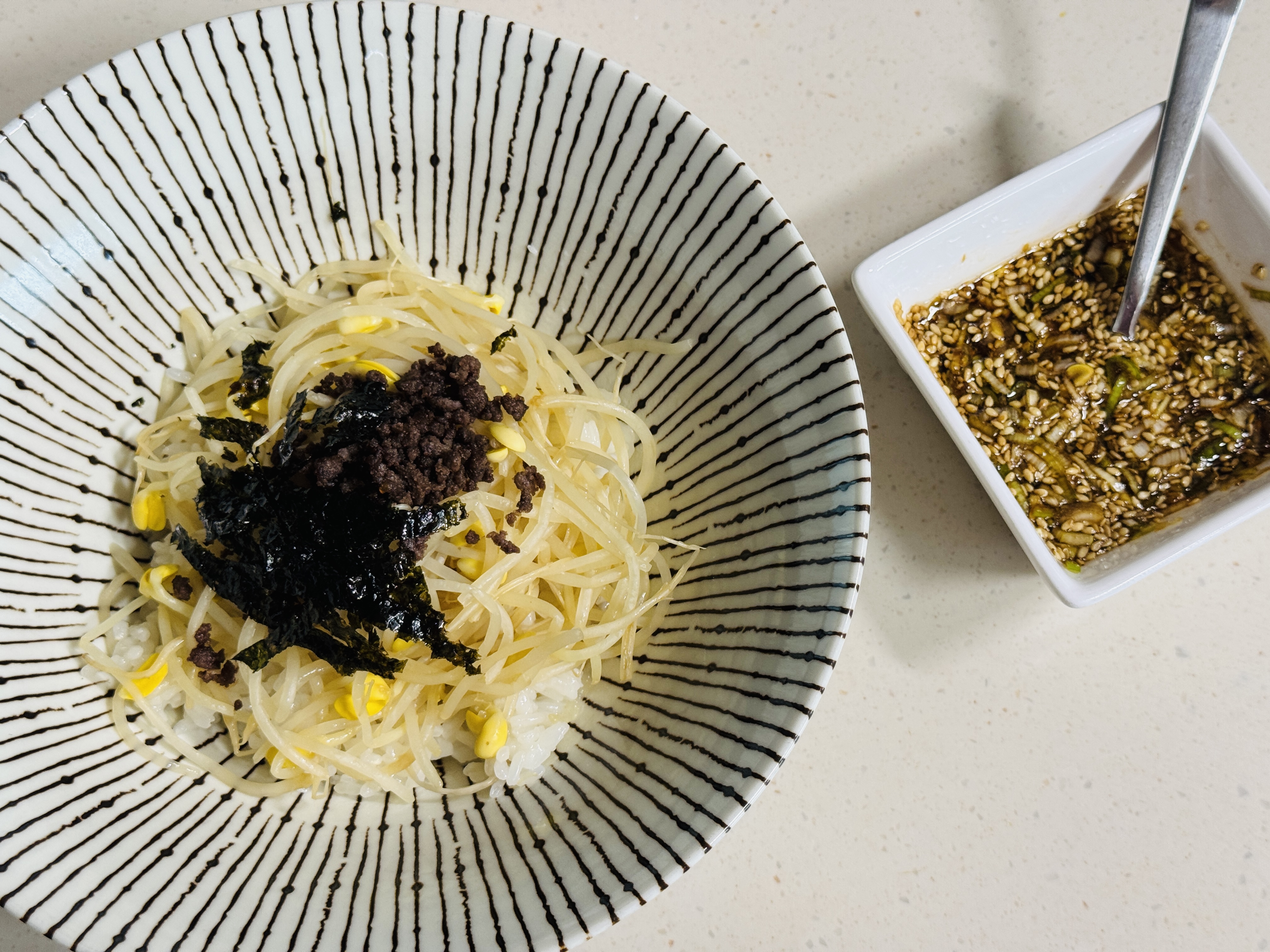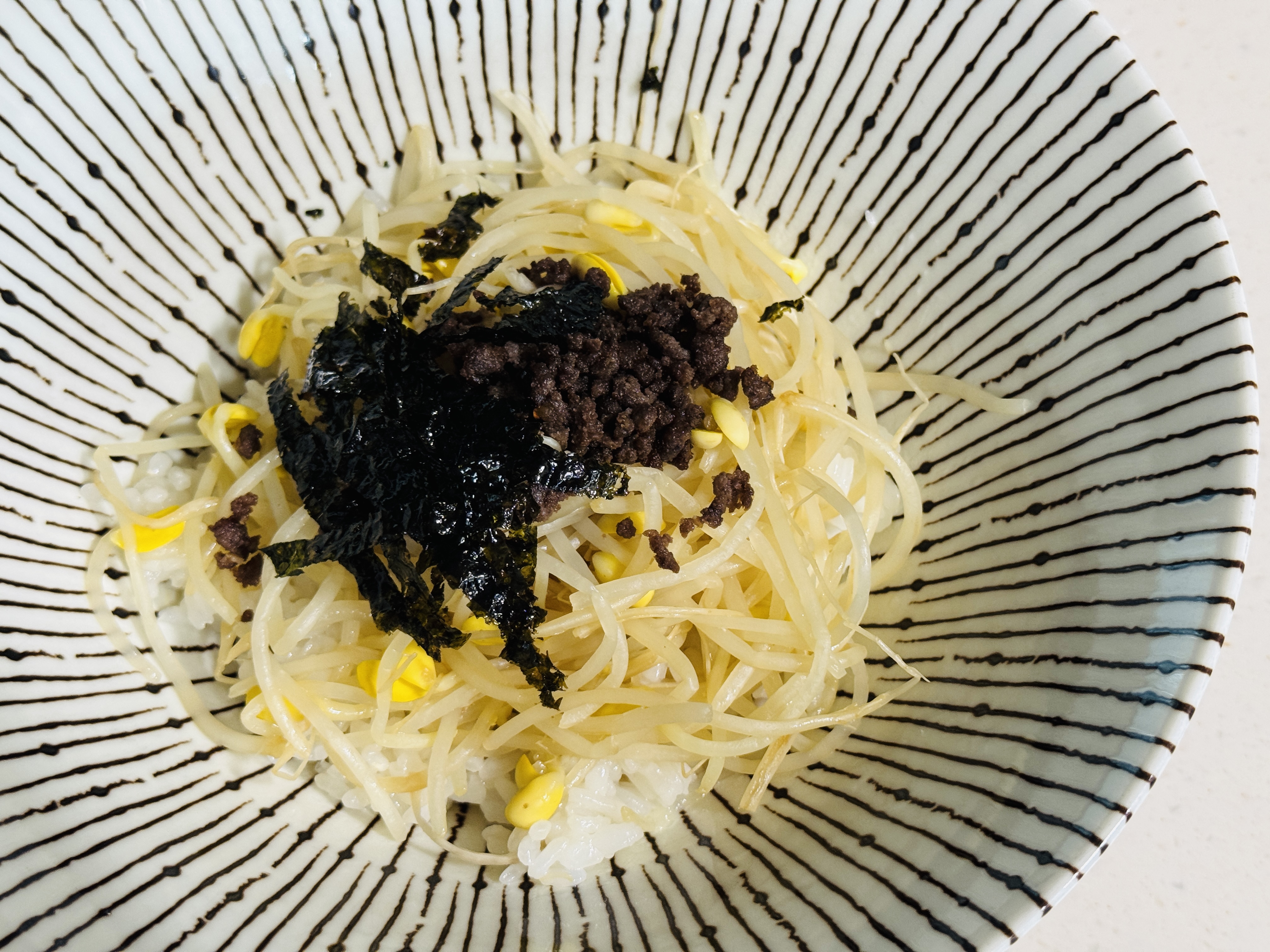 그릇에 밥과 콩나물, 버섯 골고루 담고 볶은 소고기와 조미김 올려 주세요. 양념장 넣고 쓱쓱 비벼 먹으면 바쁜 아침 속도 편안하고 맛있는 한끼 먹을수 있어요☺️