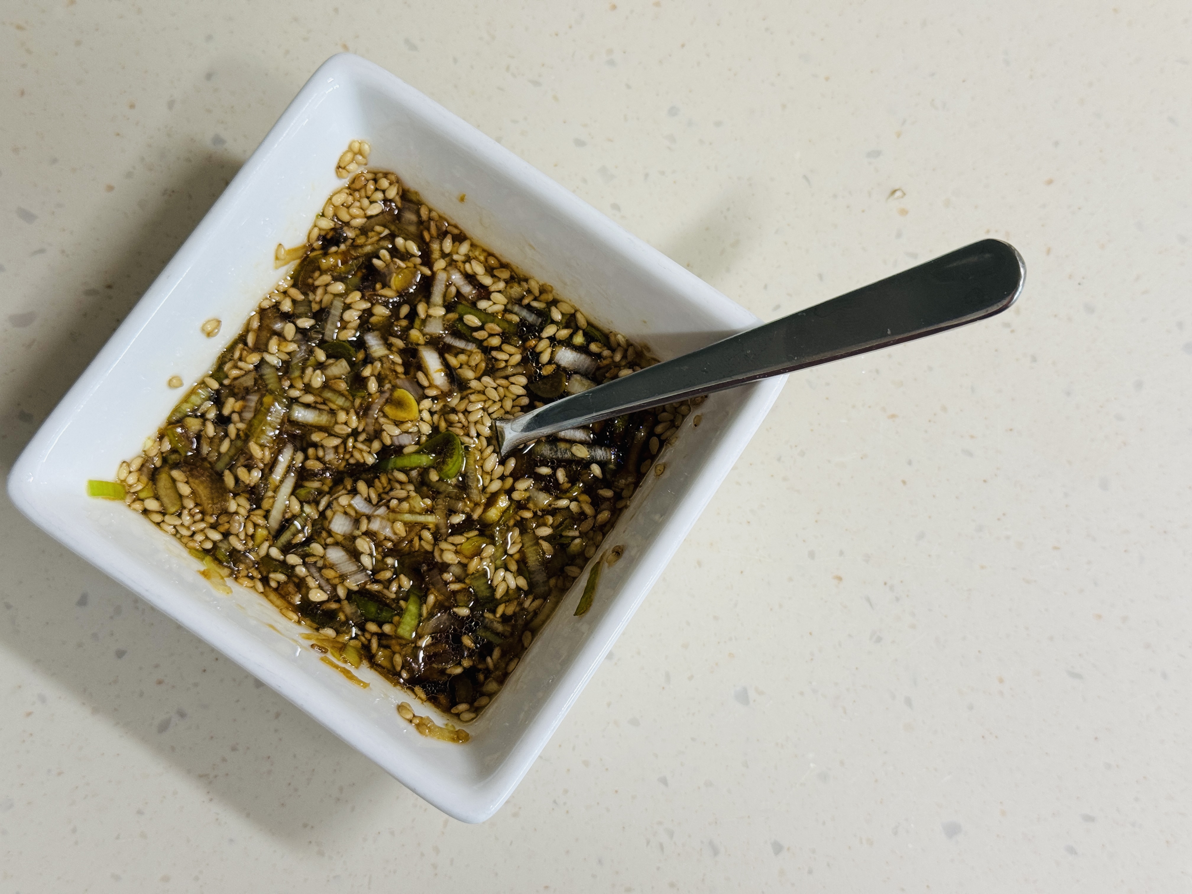 다진 대파 2T, 설탕 1/2T, 양조간장 3T, 참기름 1.5T, 물 2T 넣어 양념장 만들어 주세요.
