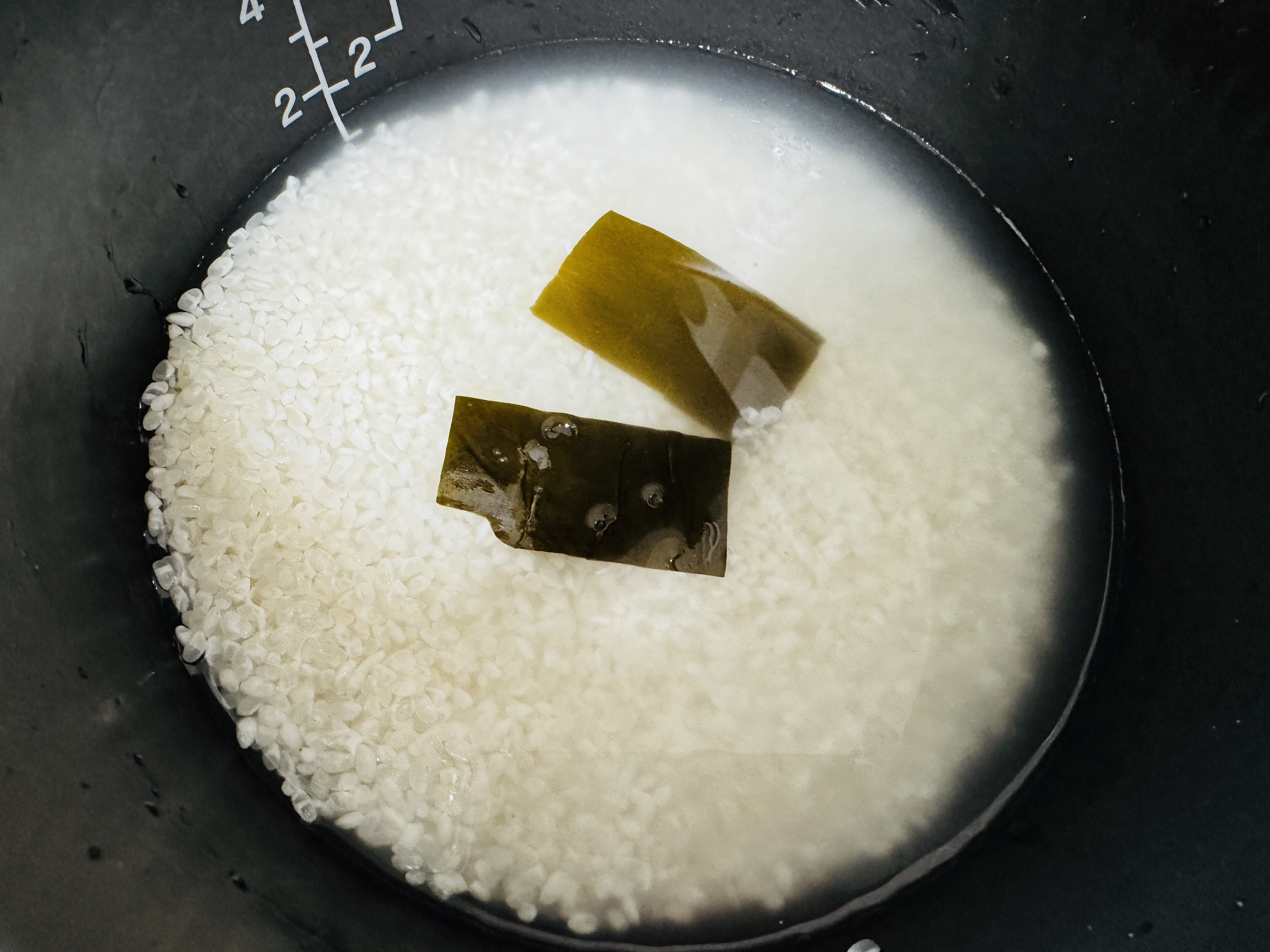 평소 물 양보다 반컵정도 물을 적게 잡고 씻은 다시마 2조각 올려주세요.