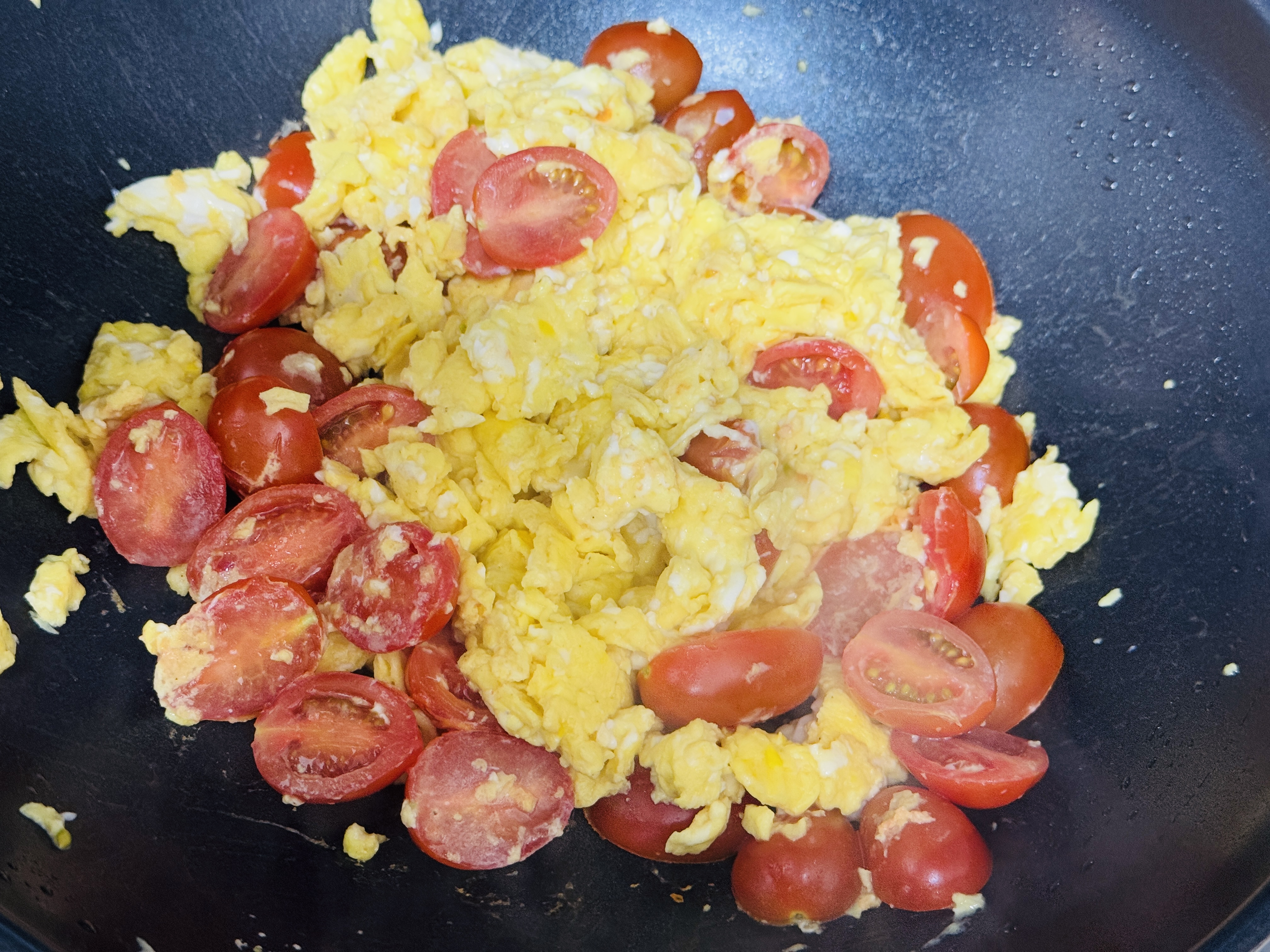 달걀이 반쯤 익으면 방울토마토 넣어 잘 볶아주세요.