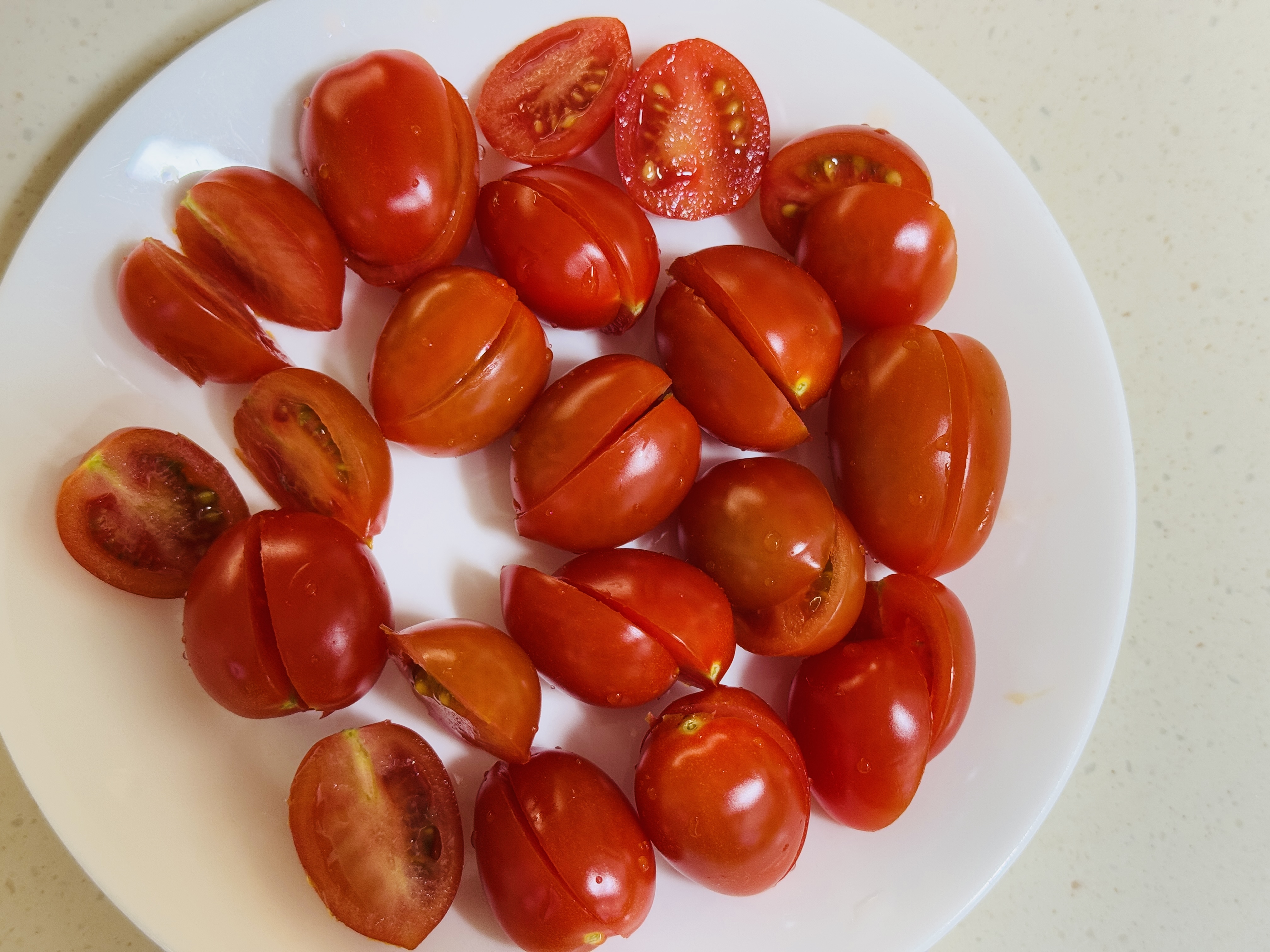 방울토마토는 깨끗하게 씻어 반으로 잘라 준비해 주세요.
