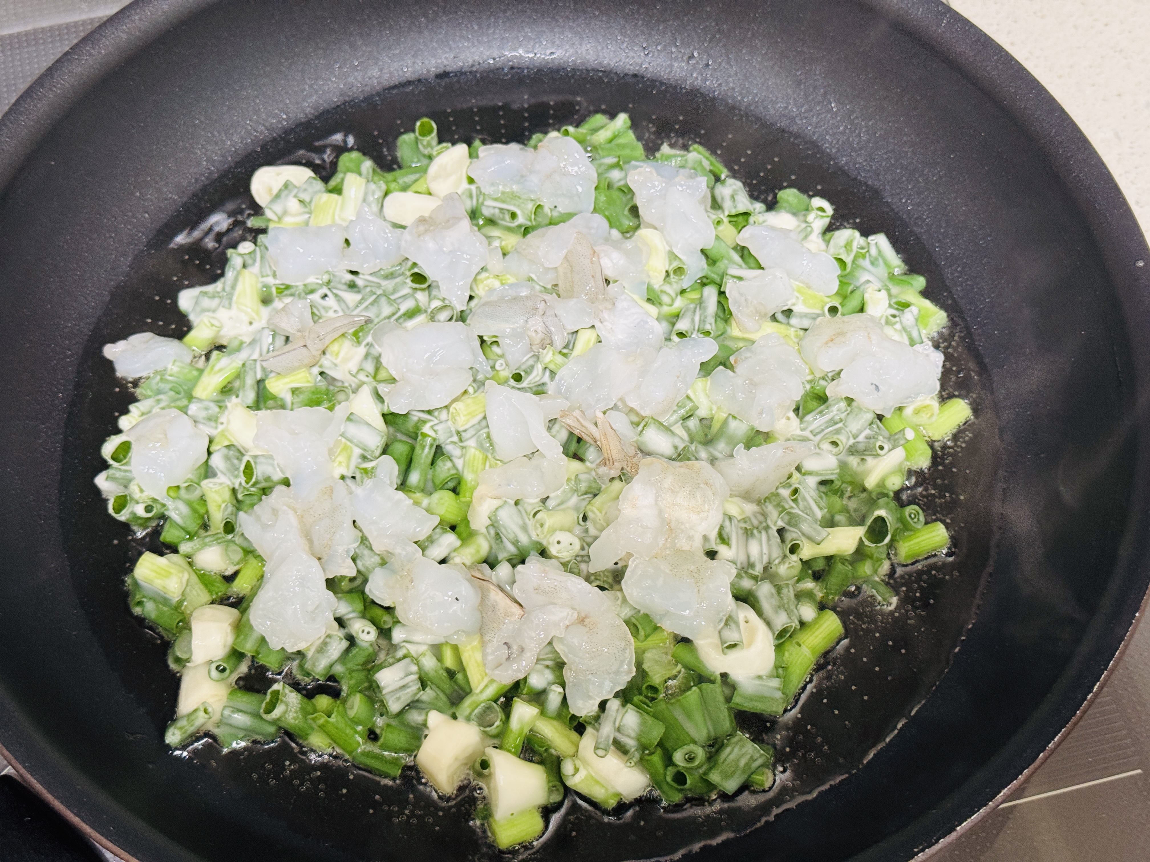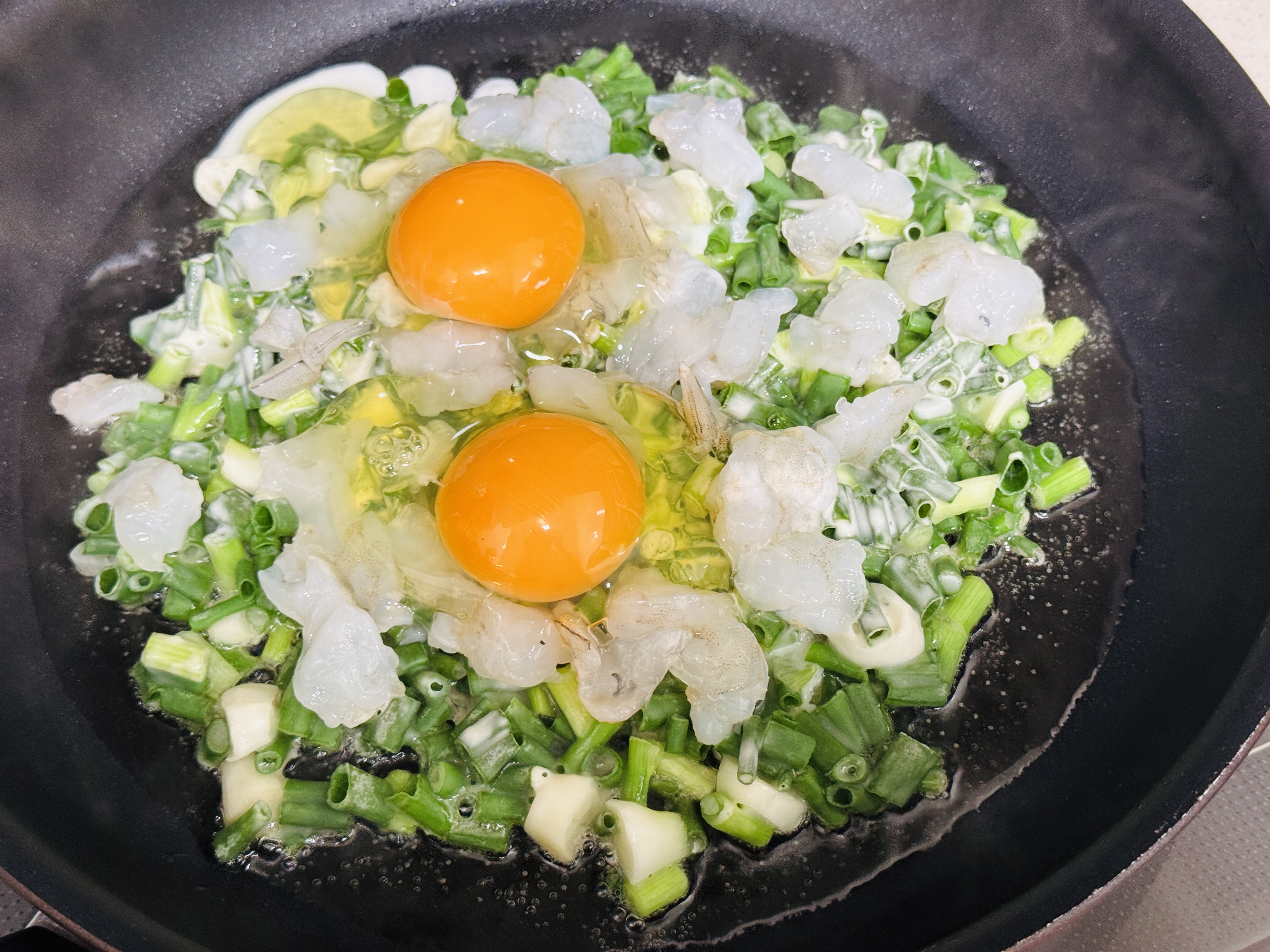 파 반죽 위에 새우를 잔뜩 올리고,
