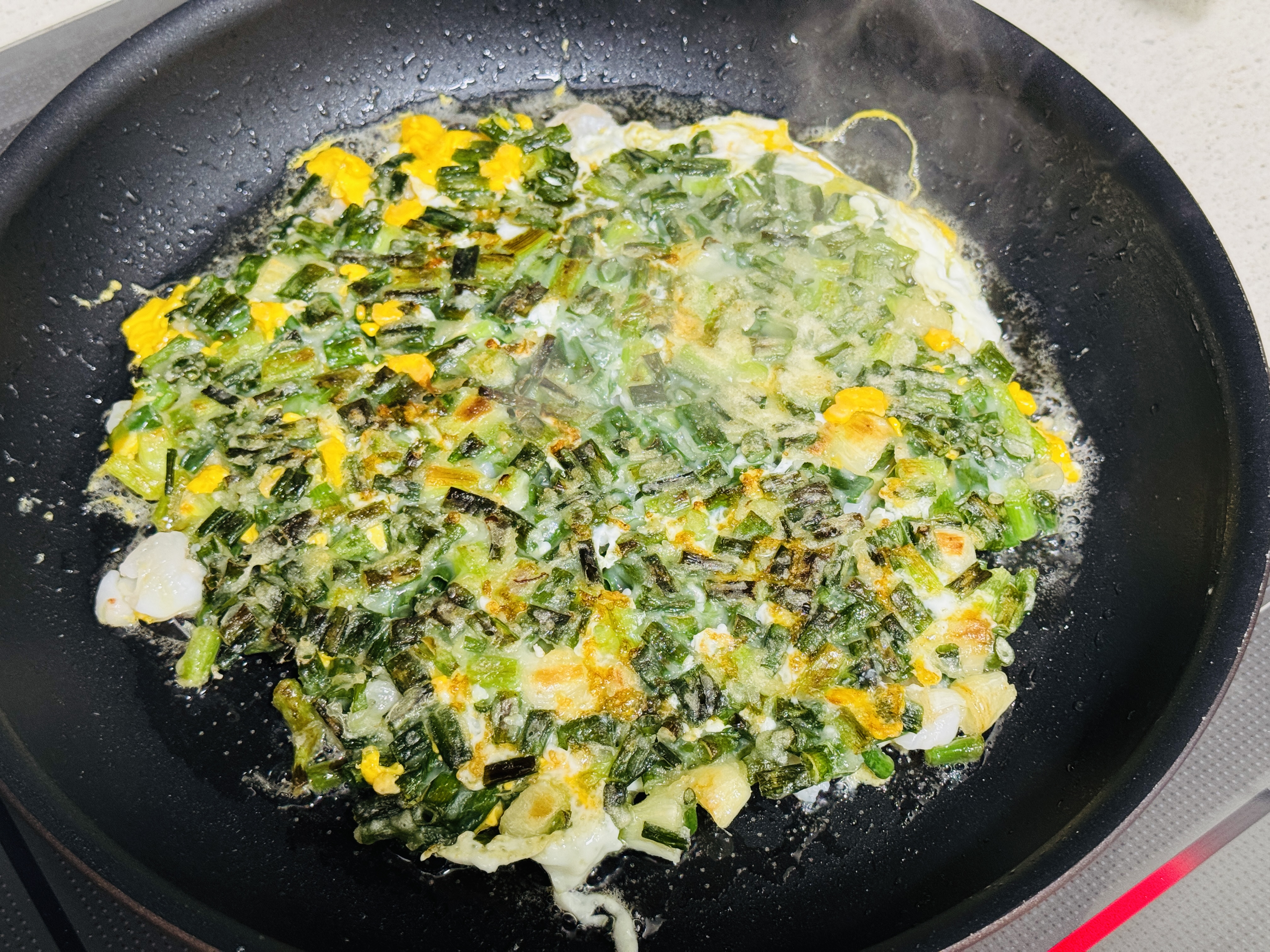 달군 팬에 기름 넉넉하게 두르고 파반죽(?) 올려줍니다.