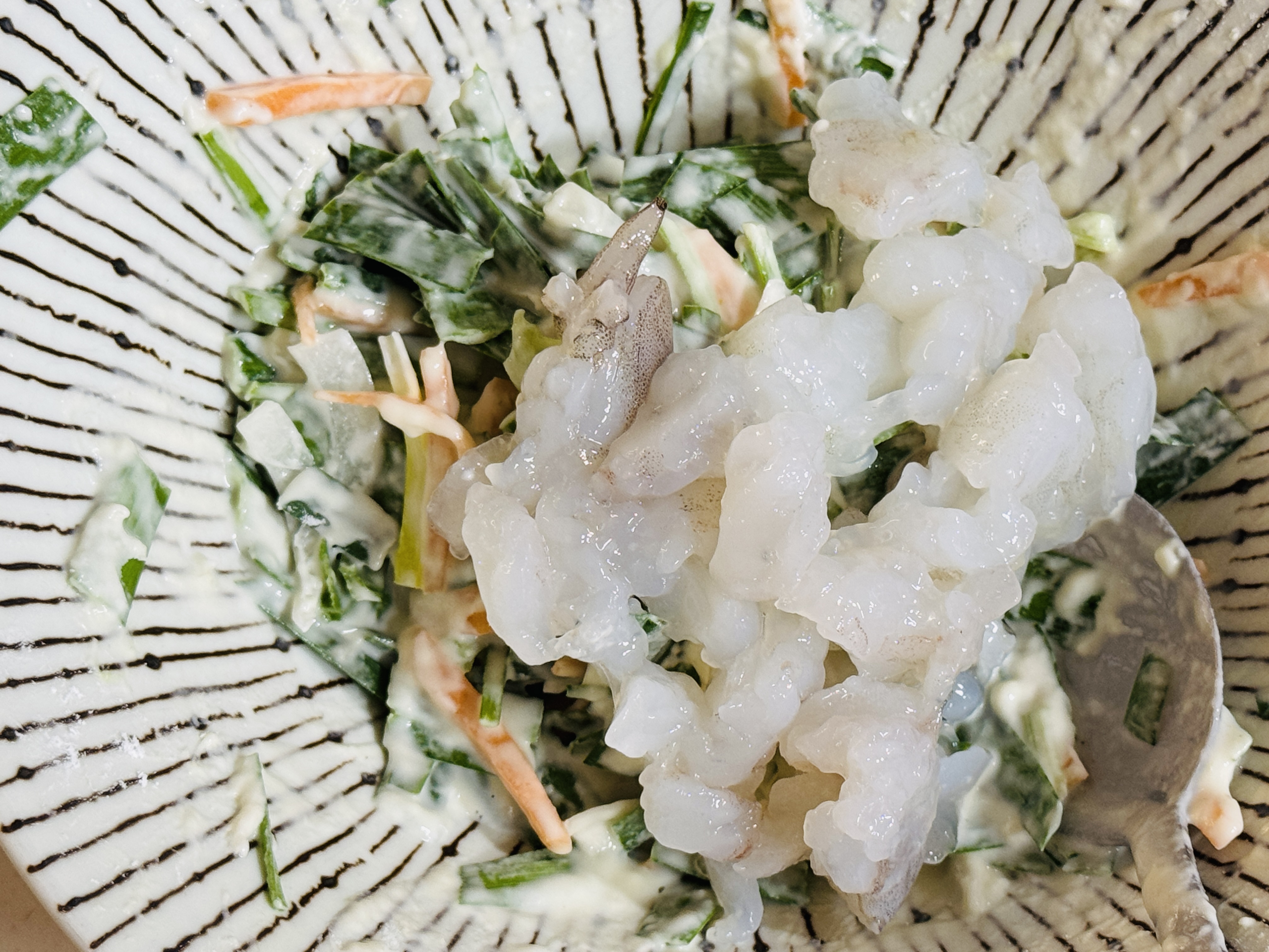 저희집은 남편이 새우 알러지 있어서 한장 새우 없이 만들고 남은 반죽에 새우 넣어 실짝 섞어준 뒤 부쳐냈어요.